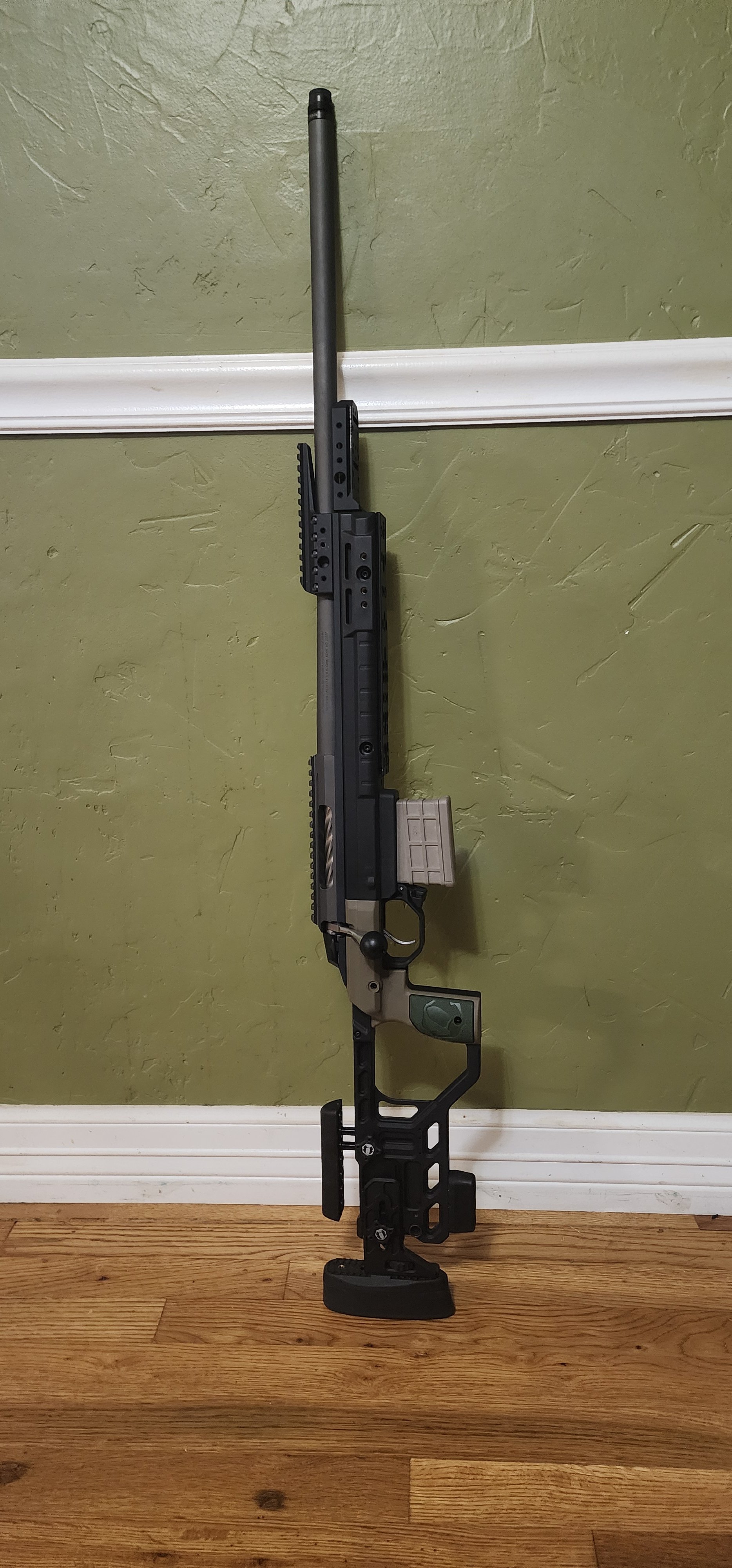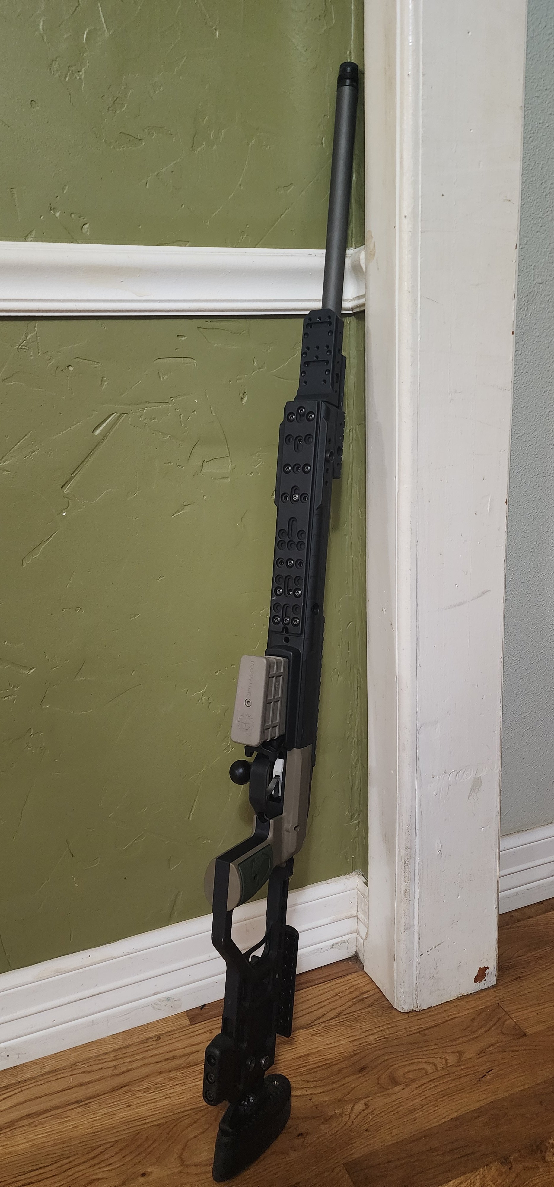 Tikka T3x super varmint in 243. Chassis is Whiskey 3 non folder with full arca, arca spigot with NV bridge. Action and barrel are factory gray cerakote. Threaded 5/8. Currently has adapter for Q style can but can remove. Will ship with 1 MDT polymer mag. Barrel is 24 inch 1:8 twist.$1650 shipped from my FFL. PP F&F or Zelle.