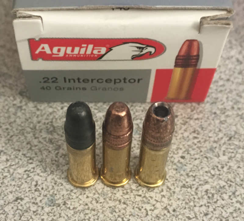 No time for it right now, as I have too many other rimfire projects, but I want to test the efficiency of hollow-points made from a Aguila 22 Interceptor which are 40 grain and rated at 1,470 FPS. It deformed the copper wash, but that shoun't have any negative effect. Left to right - CCI SV (unmodified), Aguila Interceptor (unmodified), Aguila Interceptor resized with an overly large hollow point: