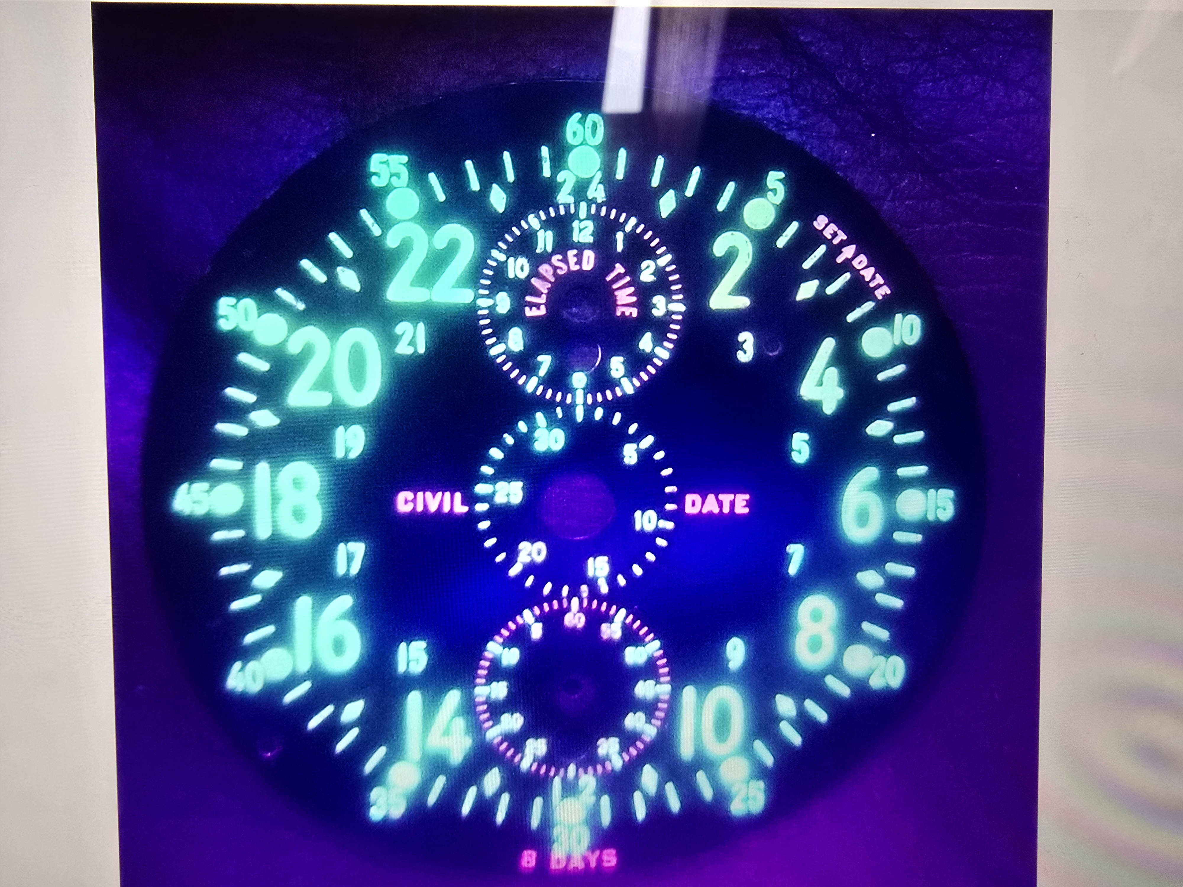 A date for the calendar which is the left small dial that is called the civil date. Top small dial is a minute time recorder which ends at 60 minutes, the far right is your small second hand which is always working, and the bottom small is your elapsed time in hours. Big and small hands are your normal hour/minute hands but in a 24 hour clock face. The large thin hand is your stop watch hand. Push the top right button and that starts your stop watch. Hit it again and it pauses. Hit it again and it resets the stop watch hand and will reset the minute counter dial small hand and hour hand.