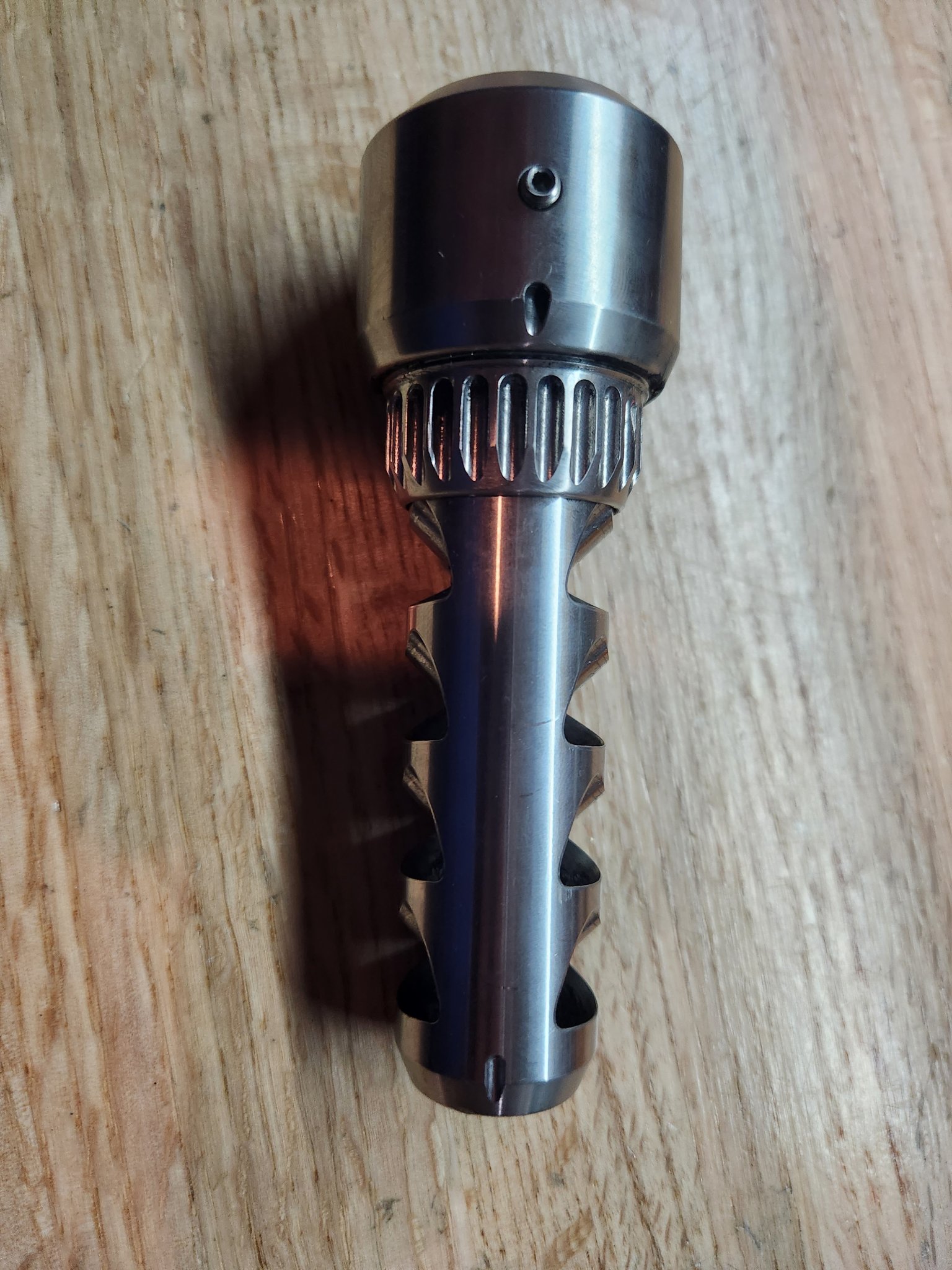 For sale is a used Strike Without Warning Tunable Muzzle Brake (TMB). Threads are 5/8x24 3A UNEF, 6.5 cal, and electroplating finish.