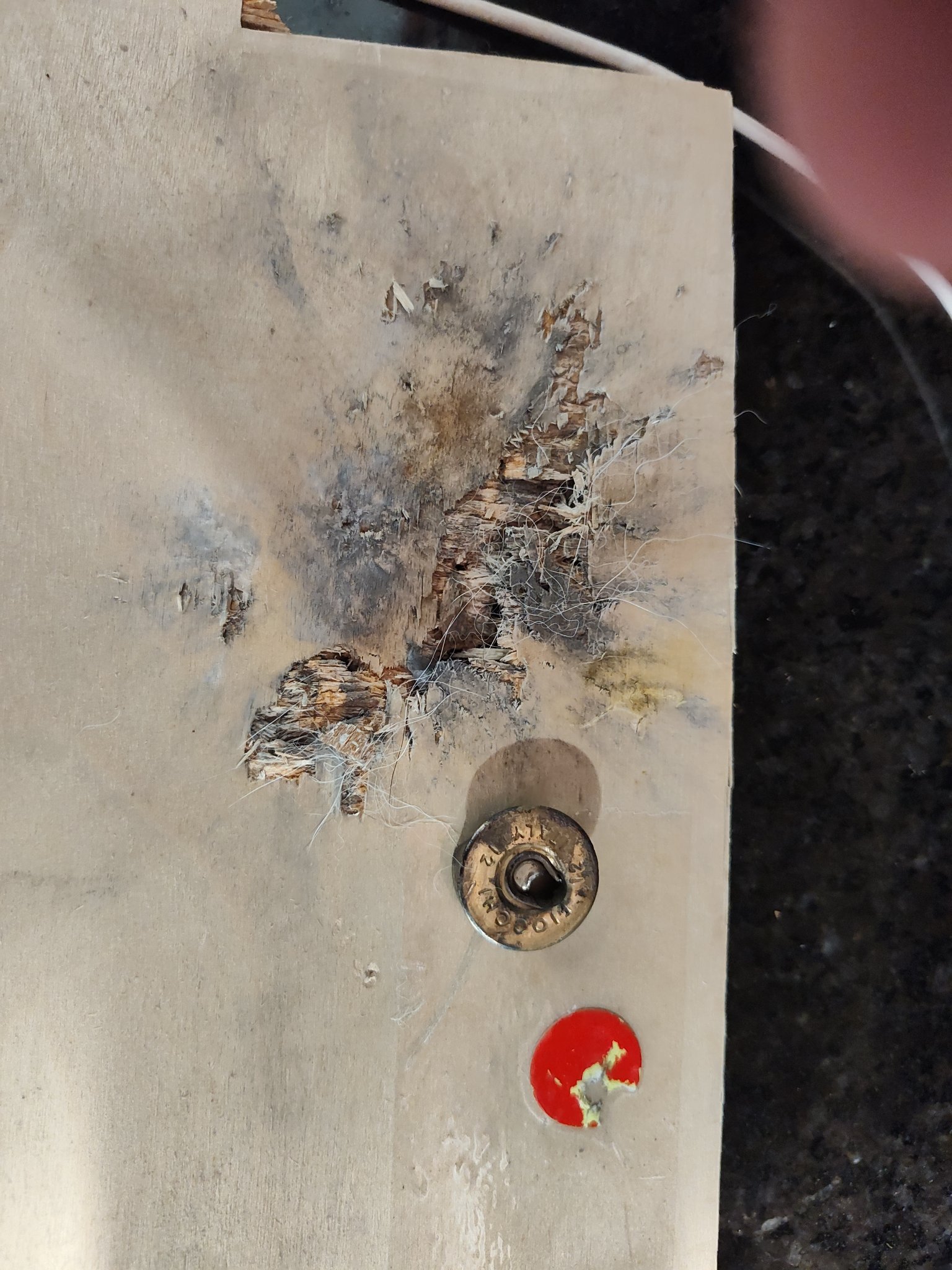 1 shot, and I hit the shells primer, igniting the shell, the powder burns are evident. Examine the board and you can see exactly where the shell was laying when hit. The shotgun blast penetrated the plywood backing.
