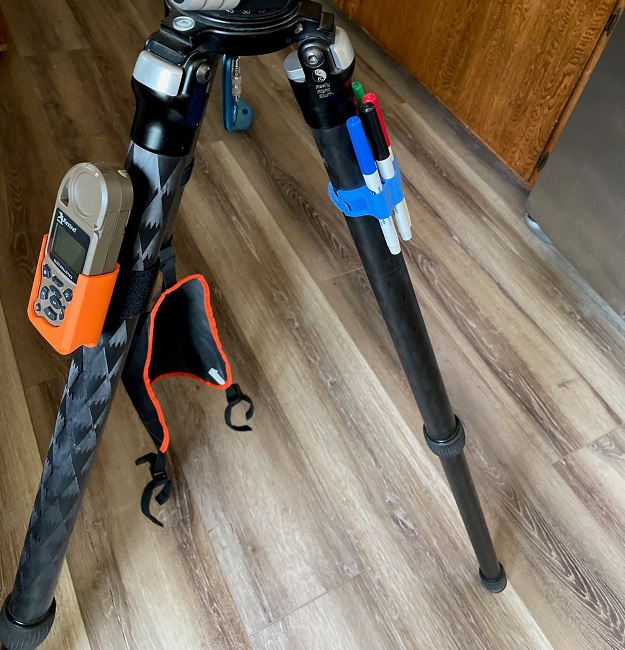 A simple tripod mount pen holder. The holder is designed to clip on a 37mm tripod leg and designed to hold 4 pens. The radius for the tripod side of clip is 18.2mm and works great on my RRS tripod. The pen holder side is made for the Expo ultra fine tip dry erase pens. There is a slot for a zip tie or Velcro that can be used for an extra secure hold, but it is not necessary. I have given a few out to friends that used them on a larger than 37mm tripod legs, but I am not sure how big of a leg it will work on. Anything smaller than 37mm would need to be padded out or it would slip down.