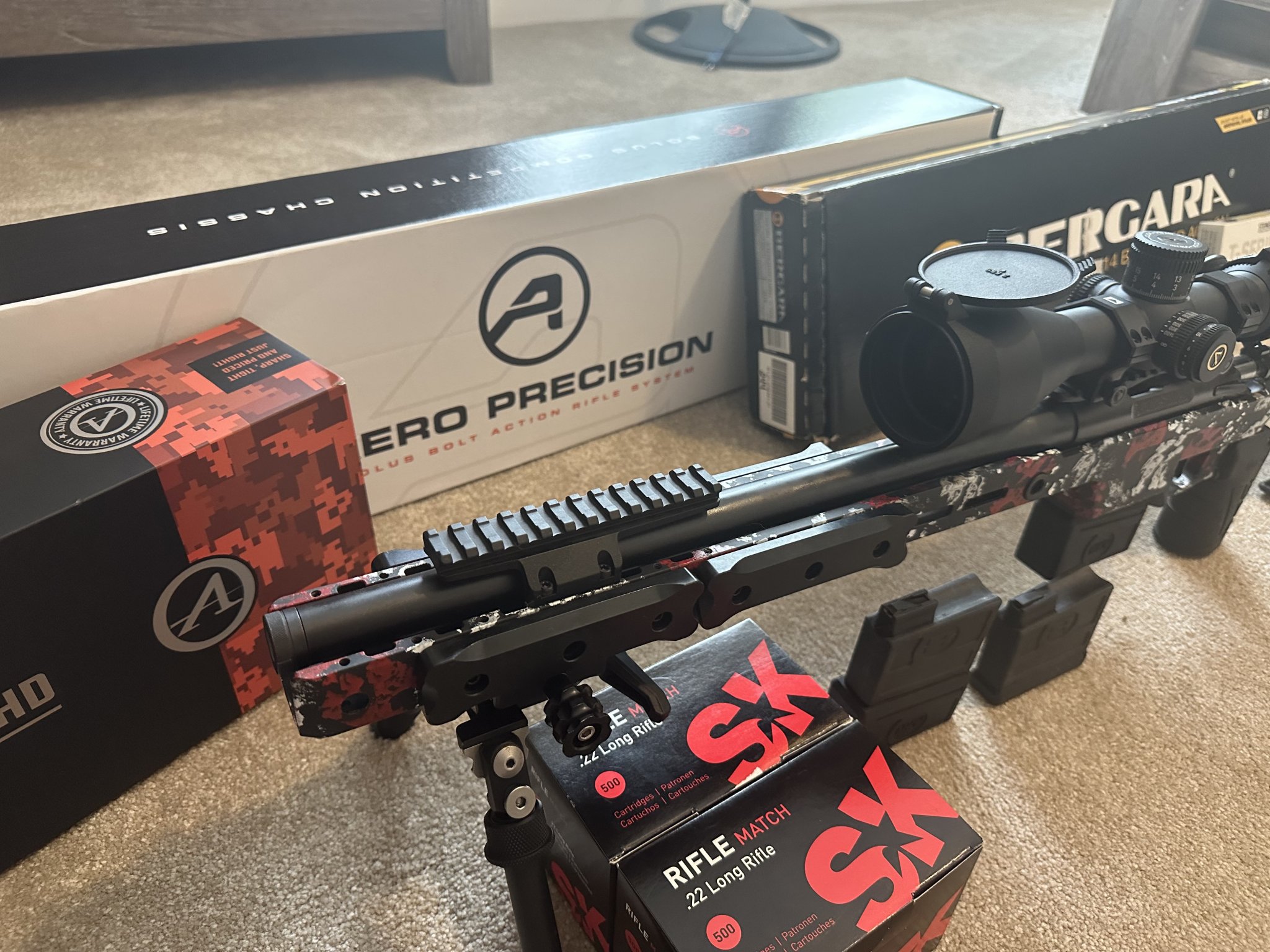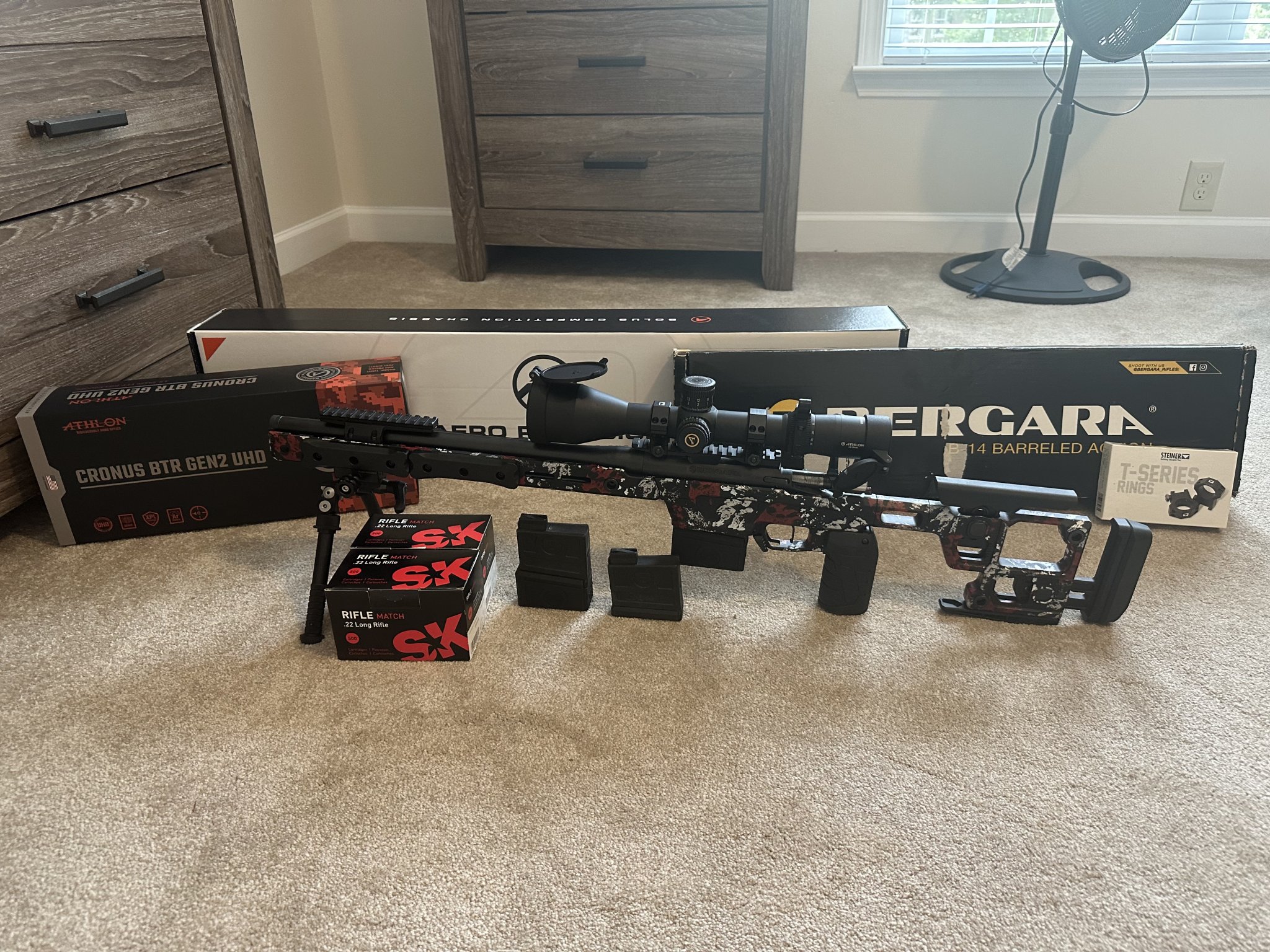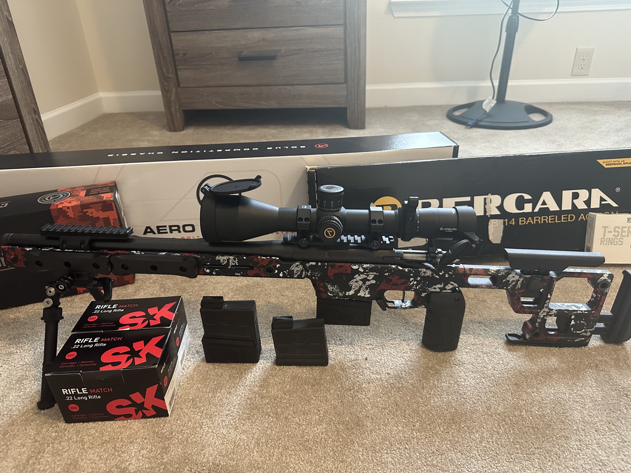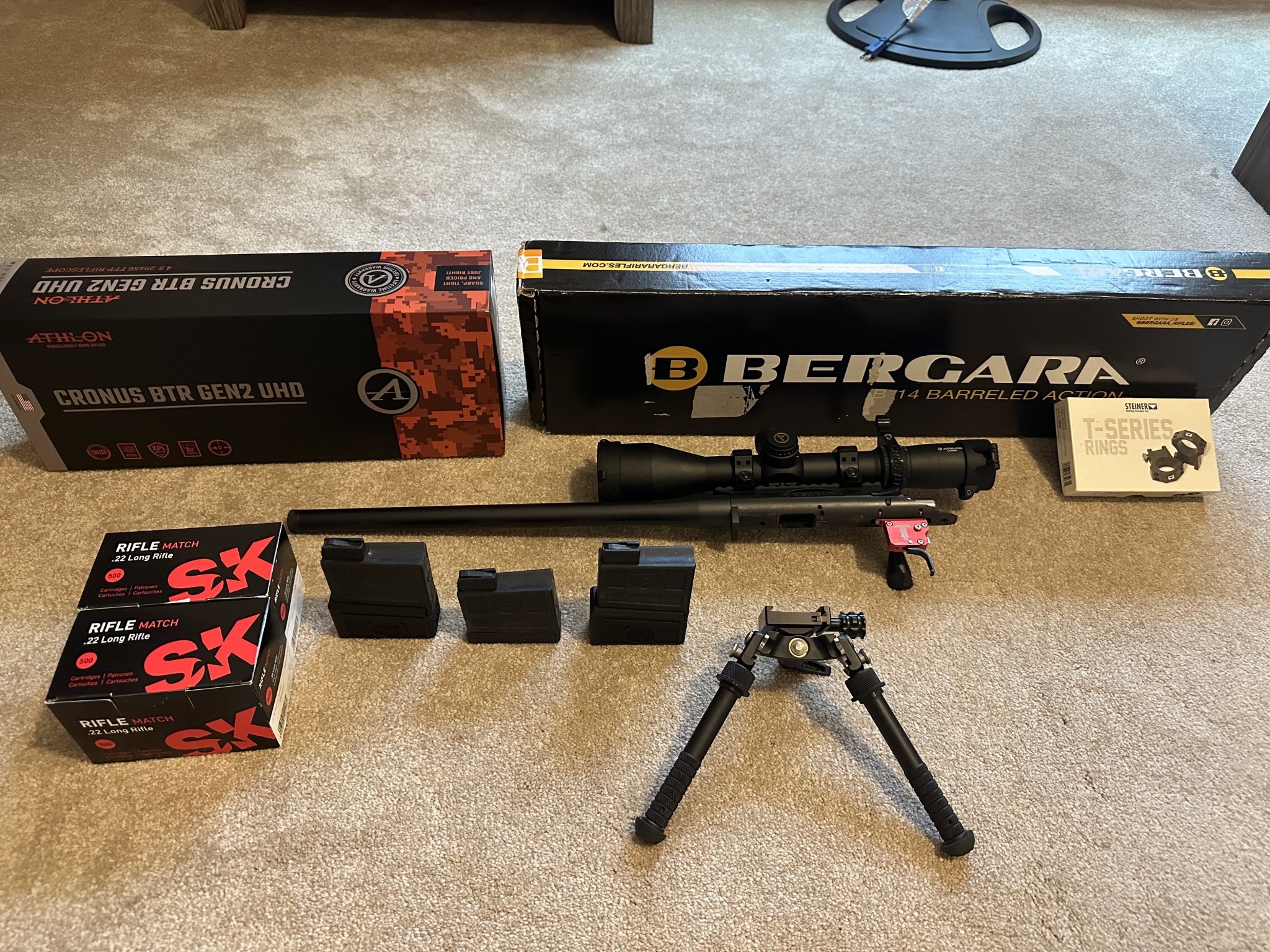 I have a full turnkey NRL22/PRS22 setup for sell. Life happens and need to thin the herd. Bergara B-14R steel barreled action with Crossroads Precision CPR shroud upgrade and trigger tech Diamond flat single stage trigger and a 30 MOA scope Mount. Sitting in a Aero Precision 17” Solus Competion chassis with the Optional nightvision bridge. Also has 2 sets of large Grey Ops external weights already installed for balance, and the grip was upgraded to a MDT Elite Vertical grip. Has an Atlas Bipod with a RRS ARCA Mount and 2 full bricks of SK rifle Match same lot and 3 factory Bergara mags, 2 have the MKM 3 round extension. Topped off with an Athlon Cronus Gen 2 UHD 4.5-29 APRS6 mil scope with MKM caps and throw lever sitting in a set of Steiner T series rings. I have the original boxes for nearly everything as pictured. Prefer to try to sell as a whole setup but will entertain offers. $3100 for everything listed. Prefer to do face to face, live in South Georgia. But will travel or ship to FFL. I also still have the original Bergara trigger in the Bergara box.