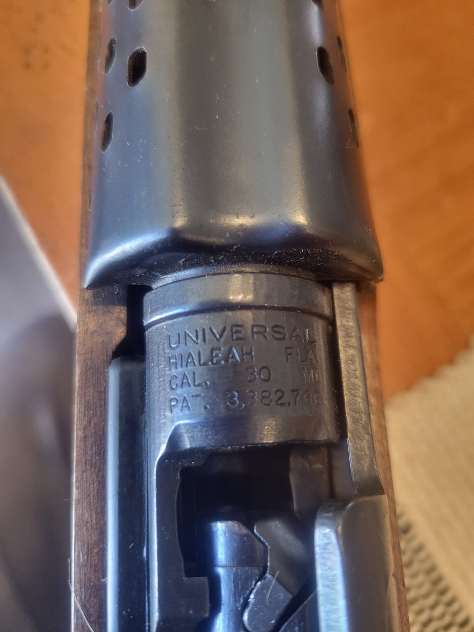 Universal 30 carbine made in the early 80's, functions as it should but not very pretty. Most cosmetic flaws are with the stock. Finish is bad and there is a small chip missing(1/16 deep, 3/8" long, 1/8" wide) at the rear tang.
