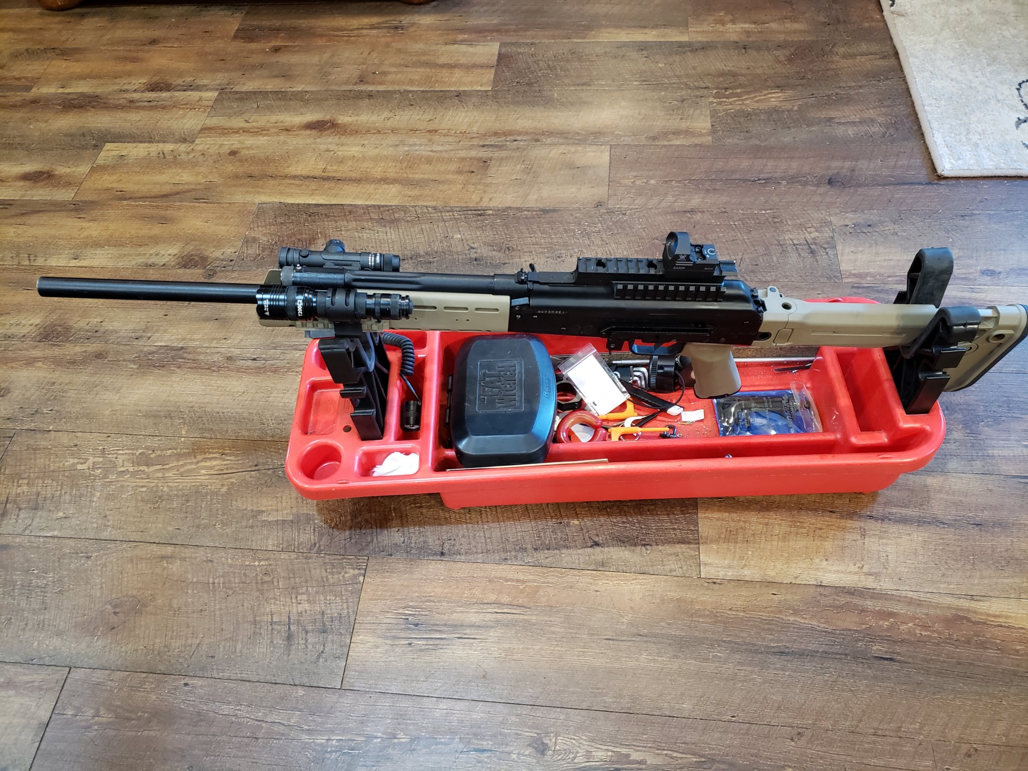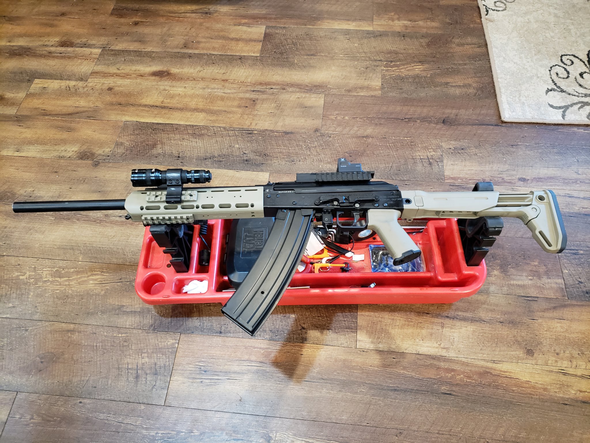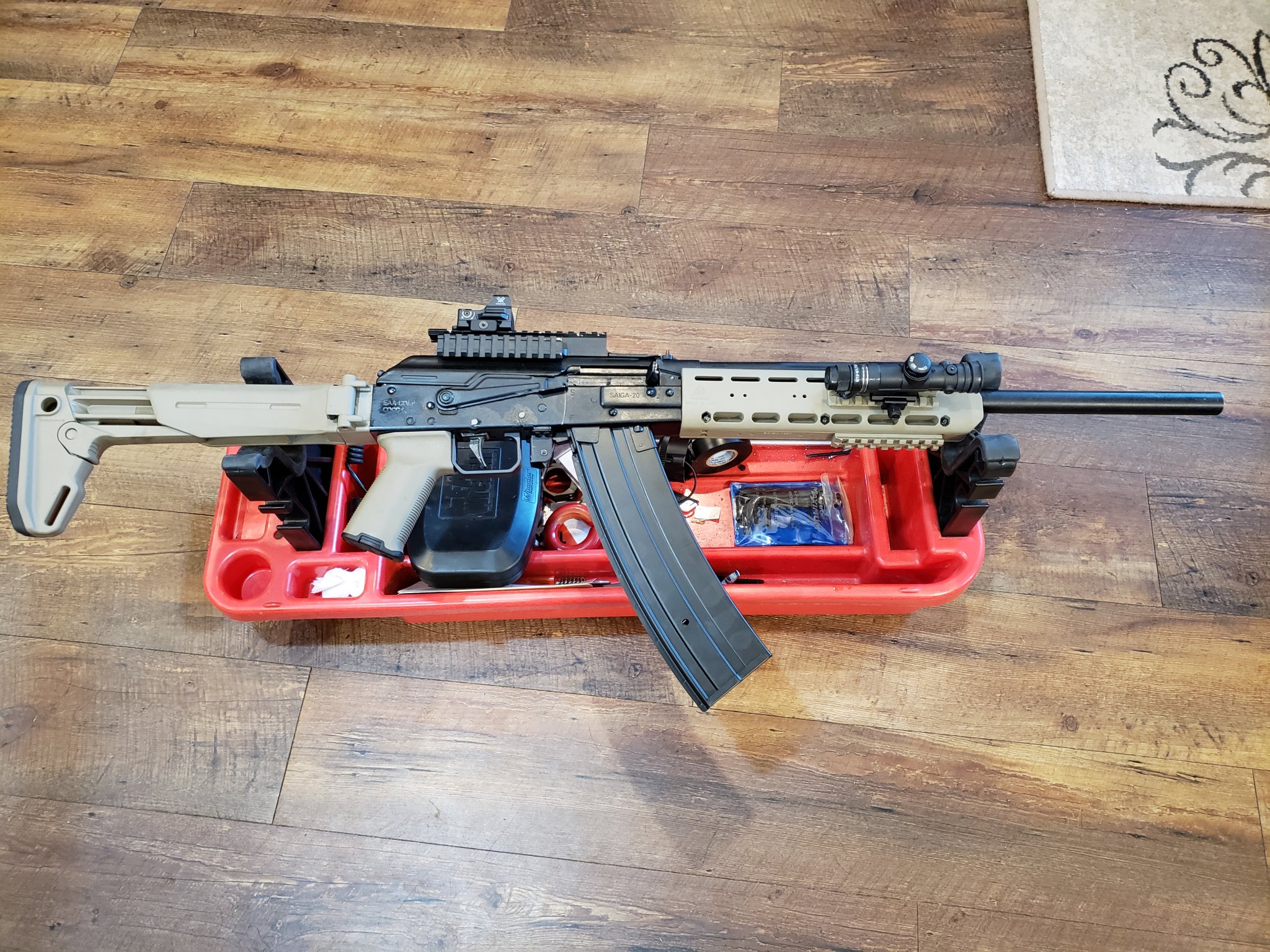 So decided to make it more fun. Carolina Shooting Supply ALG trigger kit with trigger move kit. Magpul Zhukov Stock and MOE+ pistol grip. Phoenix handguard (Magpul Zhukov did not fit). CSS 12 round mag. Easily 922r compliant, I needed 5 since there is no muzzle device and added 9. Already have the upgraded gas disk. Soooooo much better than stock. Now to take it to the range... plan on using 20ga 3/4 oz (328 grain) hollow point slugs @ 1600 fps. IR and visible illuminators, just need a Steiner CQBL and I am ready. Scope mount has a peep hole to use the iron sights. Hogs beware...