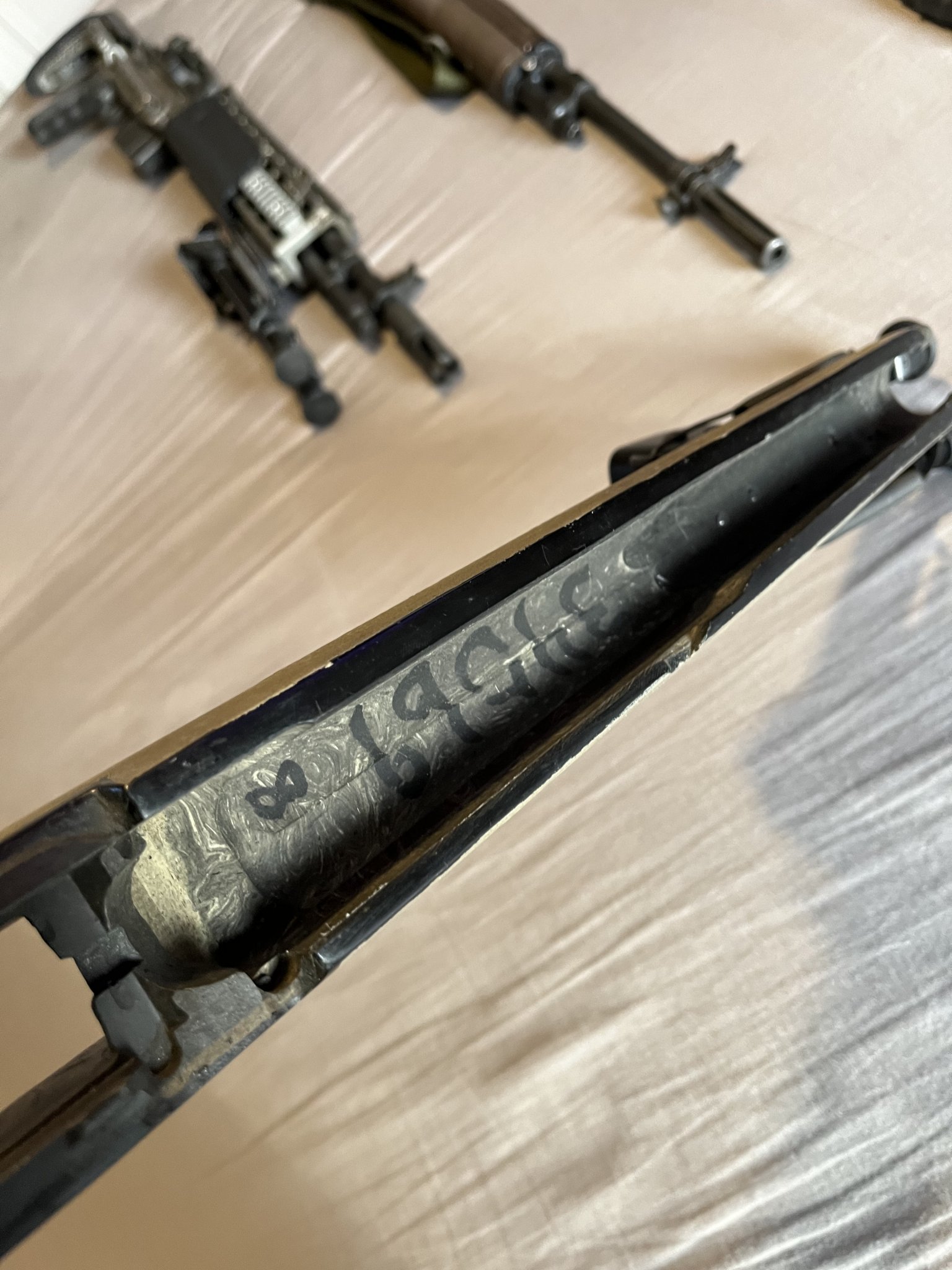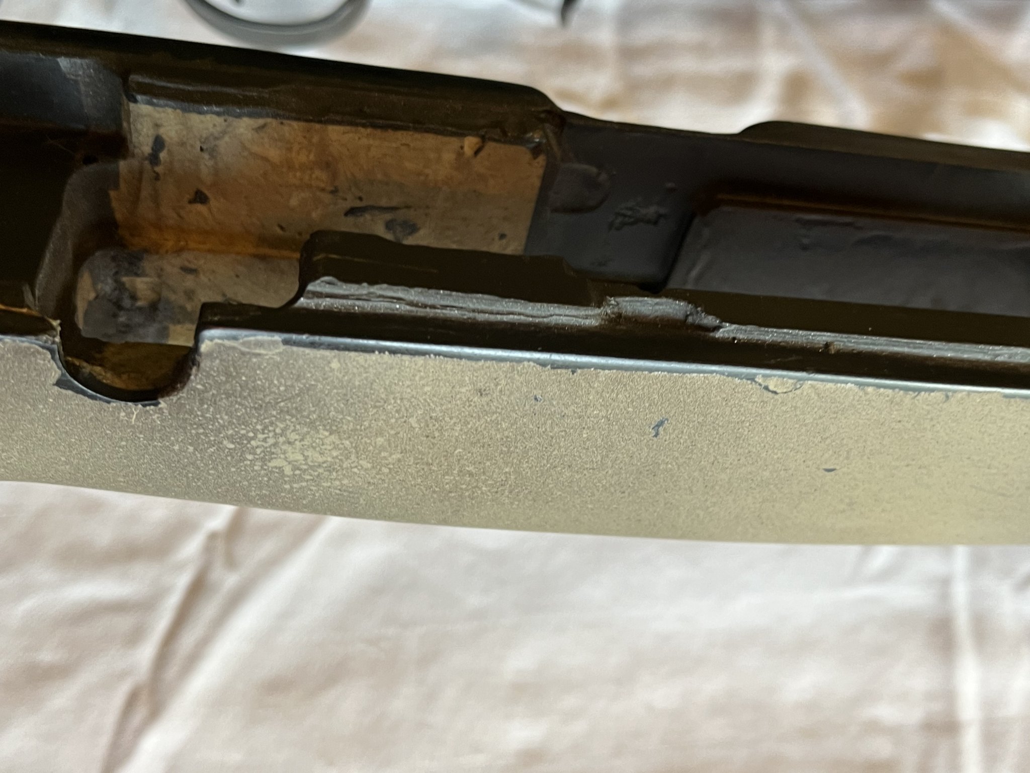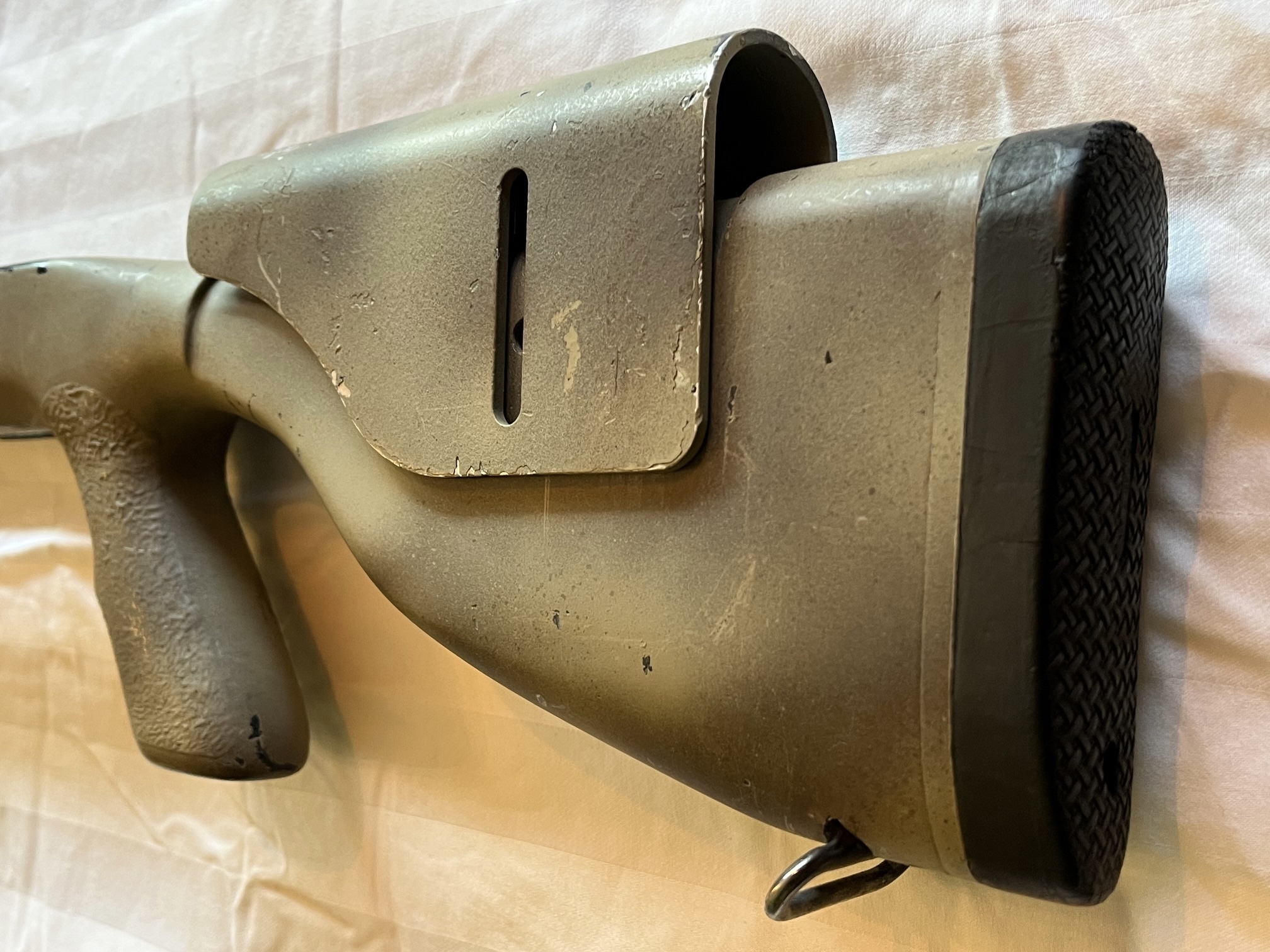 Once I got some halfway decent pics to Ryan via text, he called me. He tells me, ‘Hold on a second, you really need to look, and look hard at the stock, look for these numbers in the bedding.’ I’m 52 now, and my once awesome 20/10 vision is long gone; well, my close-up vision is now crap. I could not see any numbers in the bedding. Ryan says, ‘Go get a flashlight and really, really look!’ I go, ‘Ok, ok, let me get my glasses on, and I will have a real look.’ Ryan: ‘lol’ I could hear his excitement and maybe slight frustration at me looking without my glasses. I looked and looked again. What do you know, the glasses actually worked! Wow, freaking bingo, we found the numbers. I sent a pic to Ryan for review… he confirmed it being a real USMC DMR Black McMillan stock. Woo-hoo, we were both flipping out a little bit, well, a lot. At that moment, I was in shock, and Ryan is saying, ‘This is only the fourth black stock we now know of, and she is still painted like she went on a desert tour.’ There was another painted black stock, though the paint was removed by the owner, which I was also thinking of doing to get that same look.