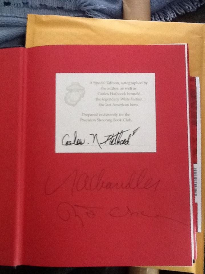 It's a first edition, HAND autographed by Carlos Hathcock on a book plate in addition to the facsimile autographs on the title page (all copies of this edition had the facsimile signatures). This was a limited edition of 250 or 500 (I forget which) from Precision Shooting.