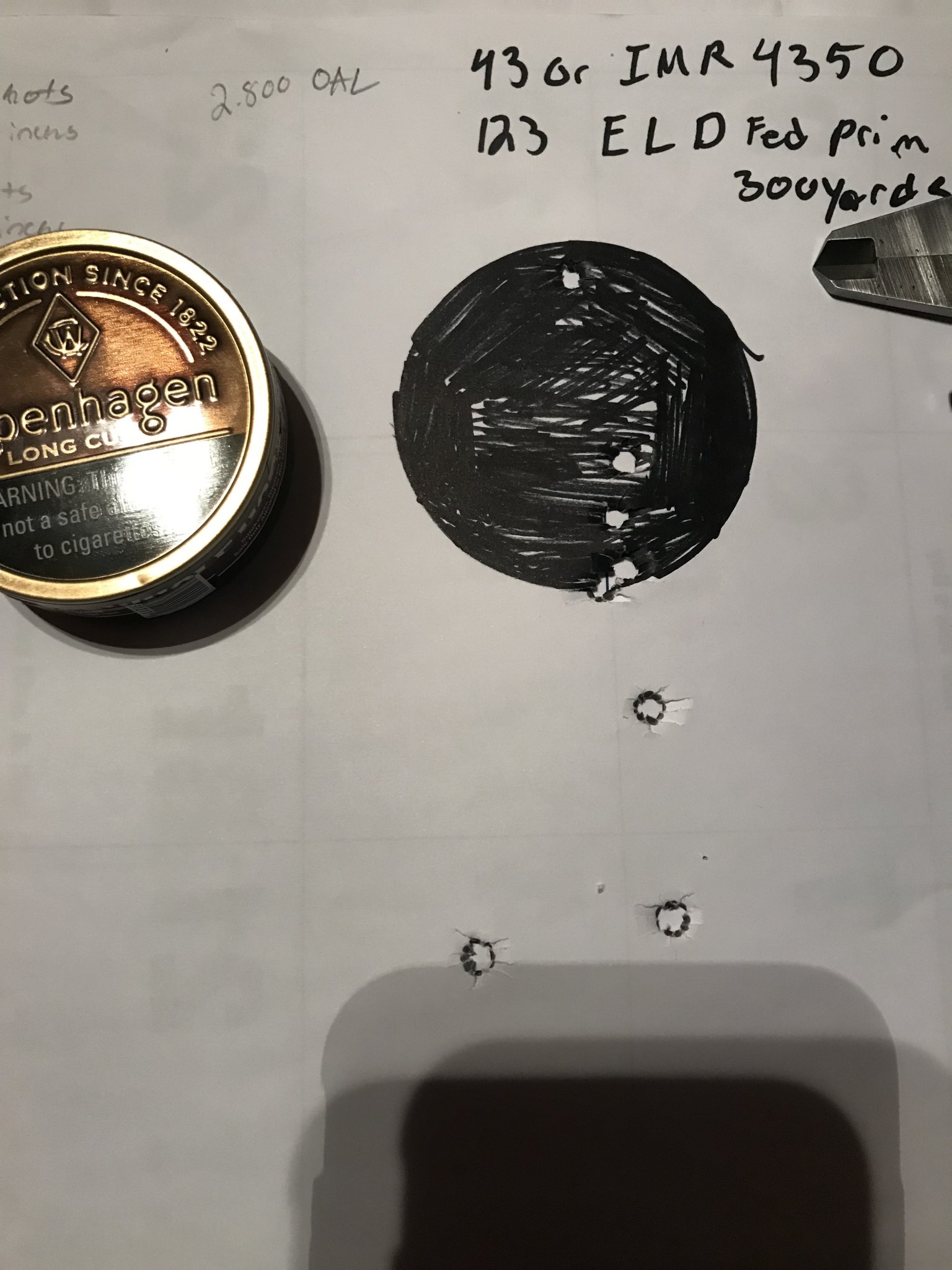 Doing some load testing today I had a 5 shot group at 100 yds measuring .6 inches figured I would test this load at a little longer range 300 yards shooting at a circle the size of a snuff can shot 8 shots 4 all in a row then walked to target checked then shot 4 more. 5 out of 8 of them hit inside the circle ranging from the bottom of the circle to the top all in a straight up in down line two dropped off about 2 inches lower in the same line and one dropped off a little left with the lowest hit on the paper .... could this be something I’m doing or could it be the load needs a little or power or less powder overall group size is 5.1 inches but all in a straight line with 5 of the shots within 2.5 inches thanks in advanced