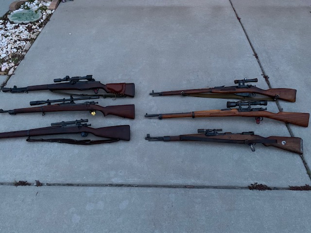 What a lovely set! And to think they are virtually all originals! I'm very partial to the Swede and I love the woodwork on yours. It's very hard to have favourites when you have so many beautiful historical pieces. I'm glad you still shoot them, it must feel pretty special. Bravo!My snipers. All are original with the exception of the 03a1