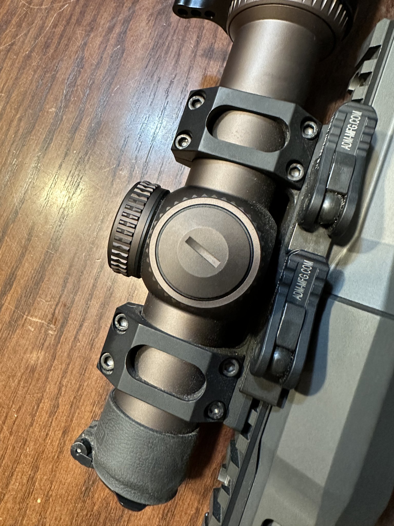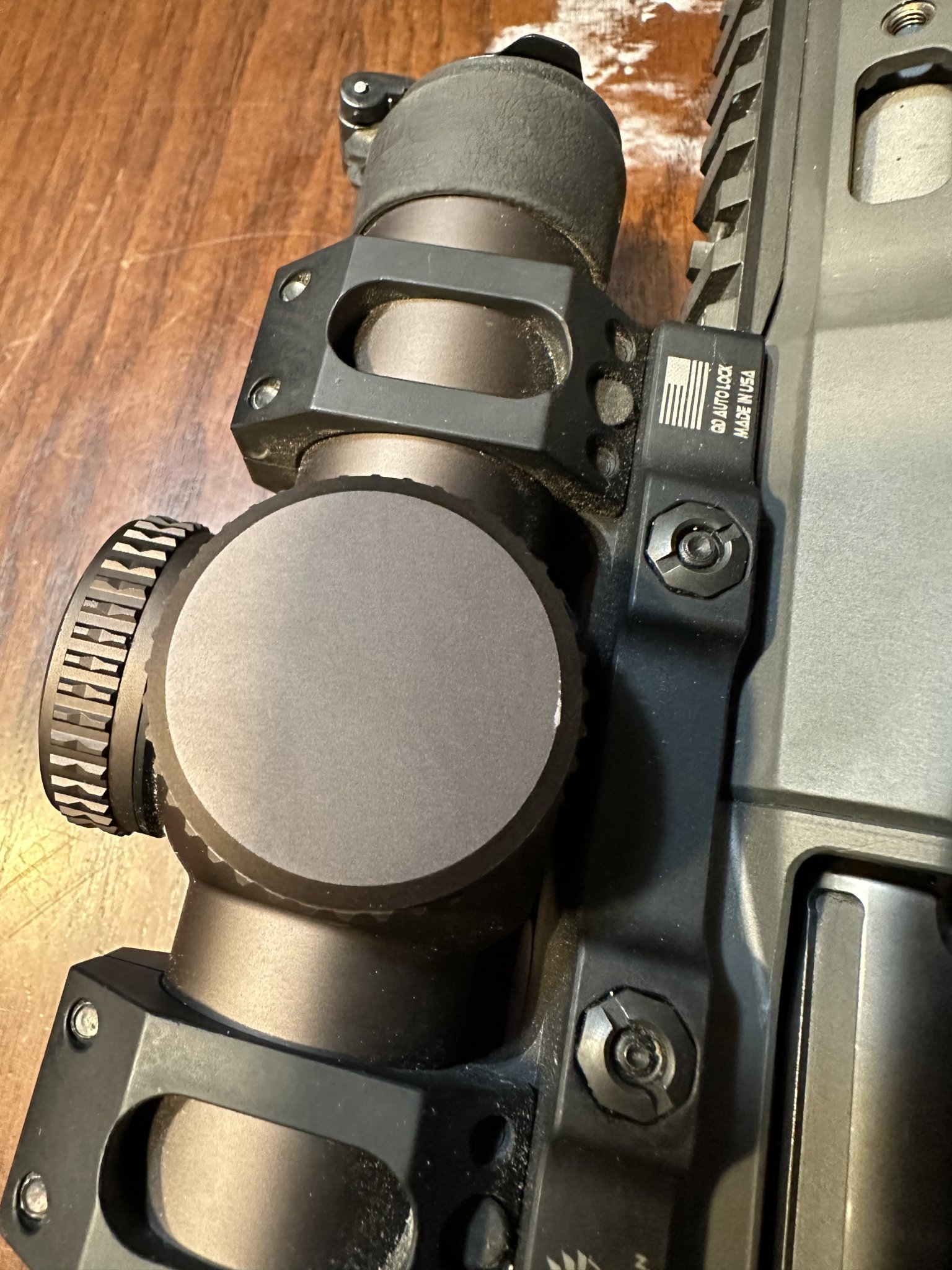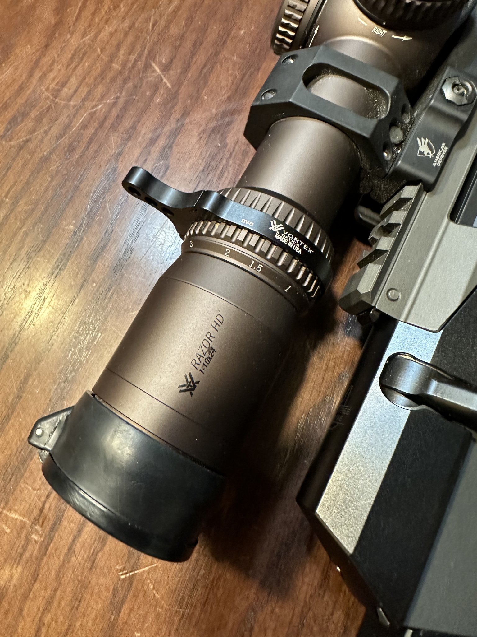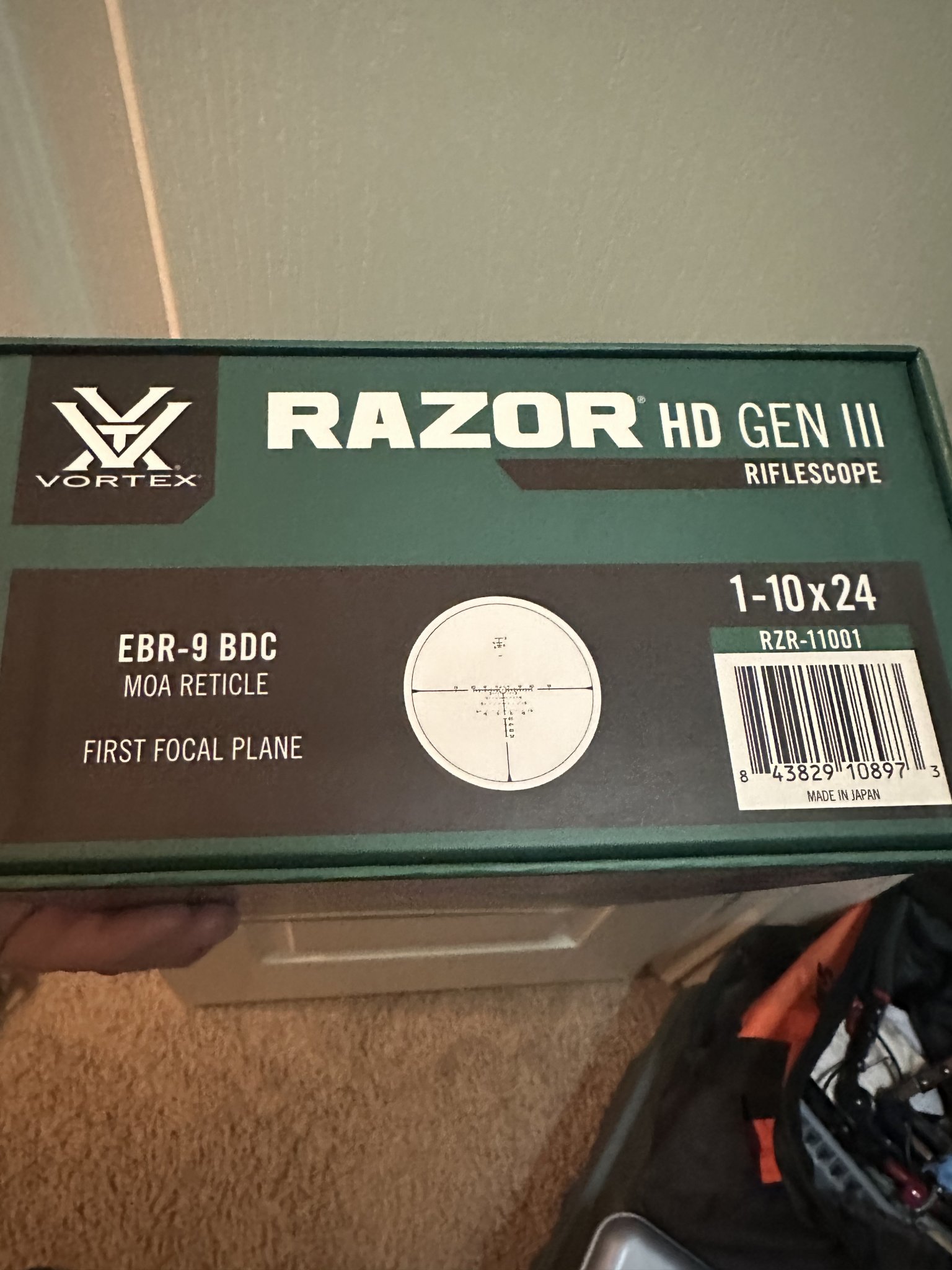 Excellent Gen III Razor 1-10. It’s sitting on my Mini Fix at the moment . Comes with American Defense quick detach mount . Scope body and glass are flawless . Windage cap has a tiny shine mark (in pics) . Comes with factory box and papers, throw lever .