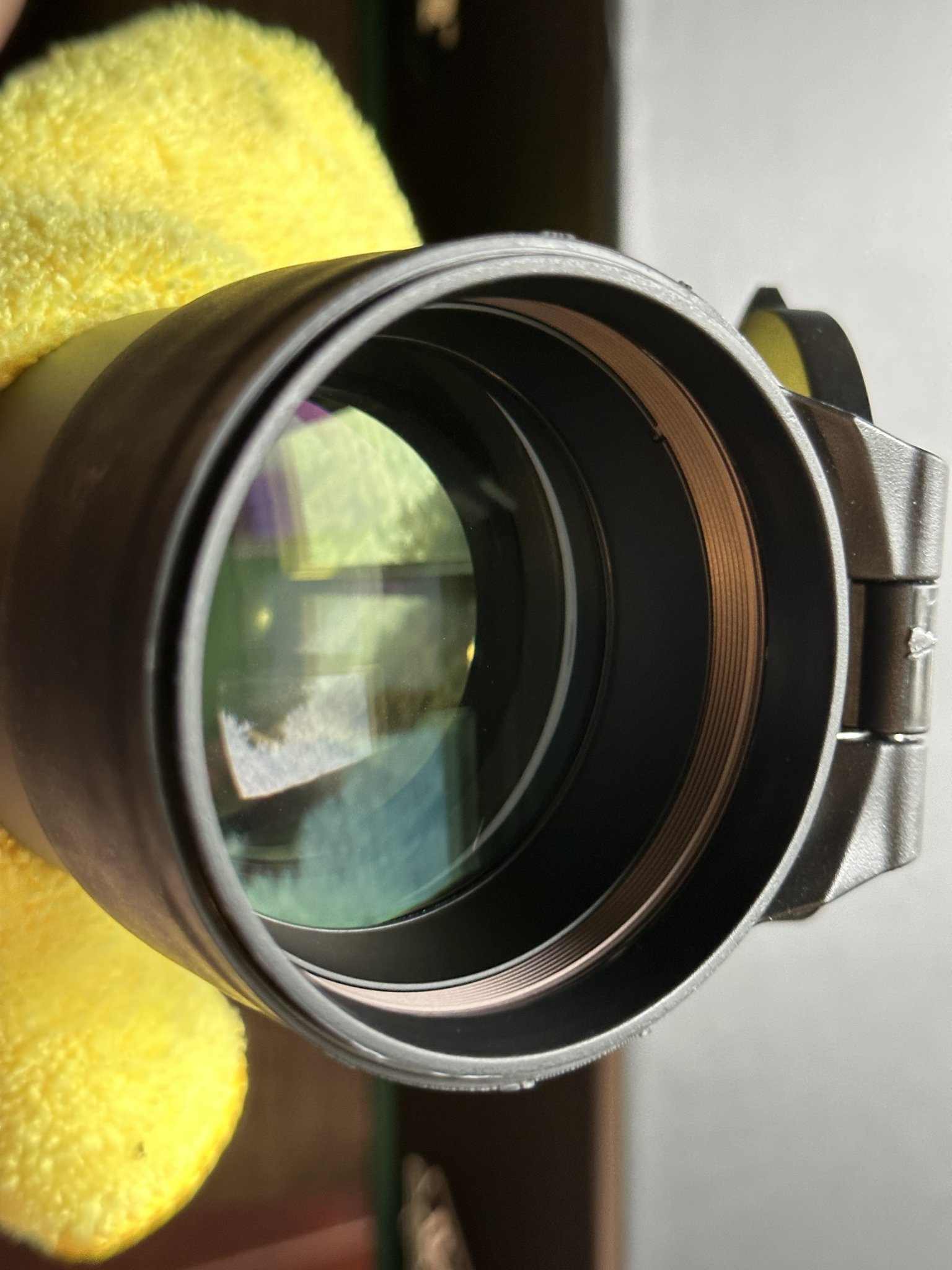 No scratch mark. Comes with caps and all the original stuff (sunshade, tools).