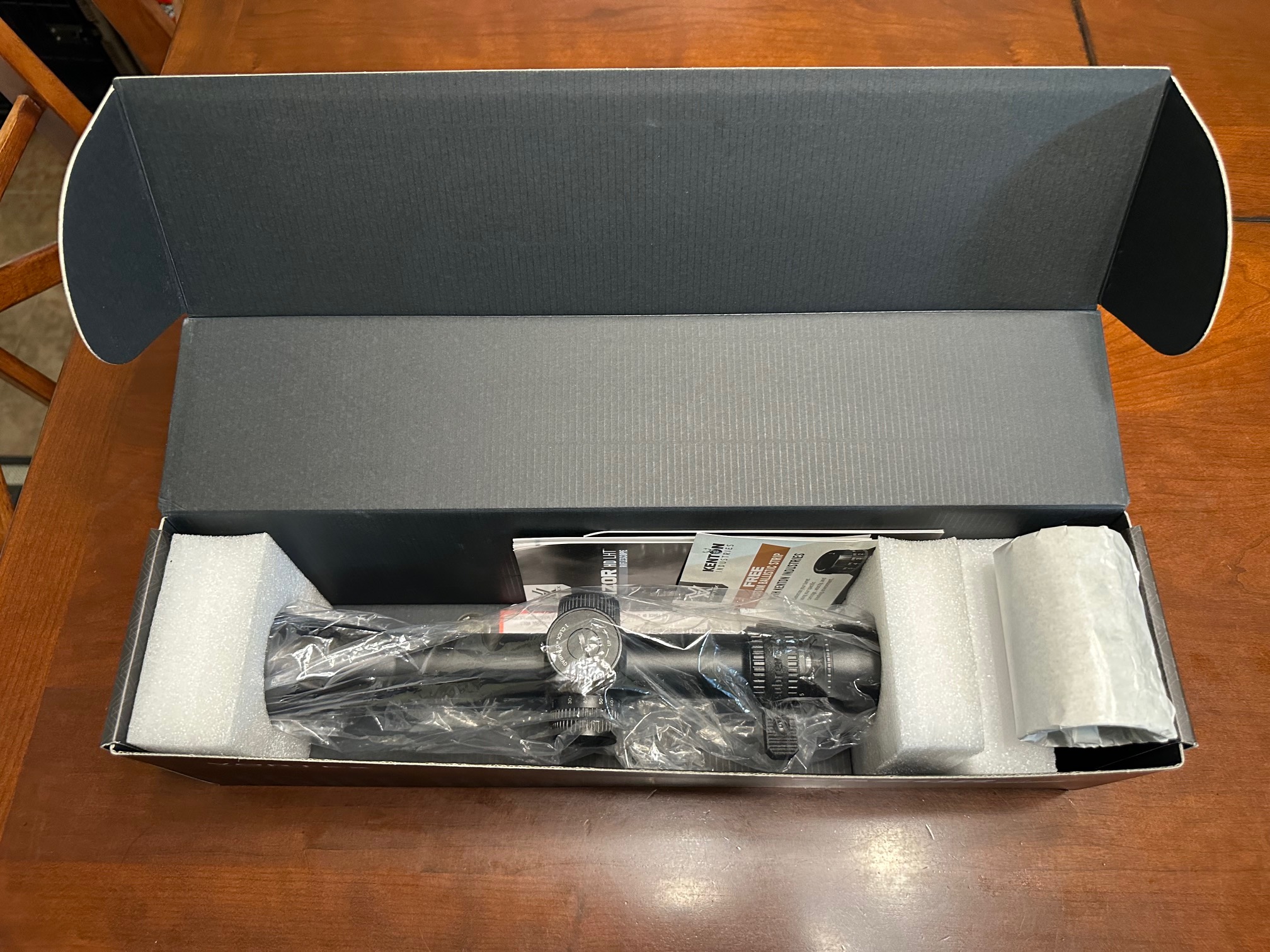 Included is the factory box and all paperwork. Lifetime warranty through Vortex as always.
