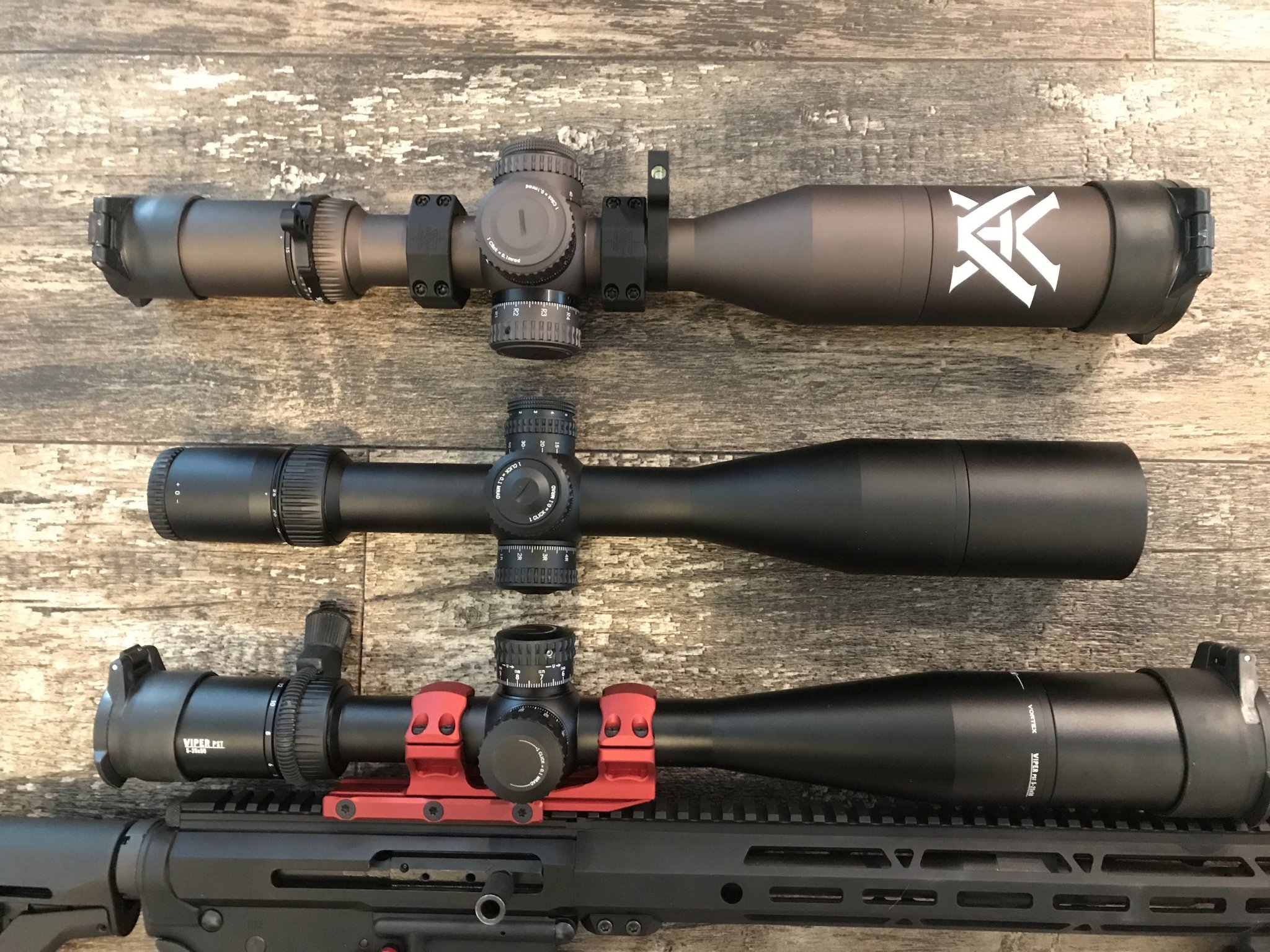 For some idea of what the Strike Eagle looks like next to known scopes here it is with a Razor II 4.5-27 on top and the PST Gen II 5-25 below it. All have sunshades on.