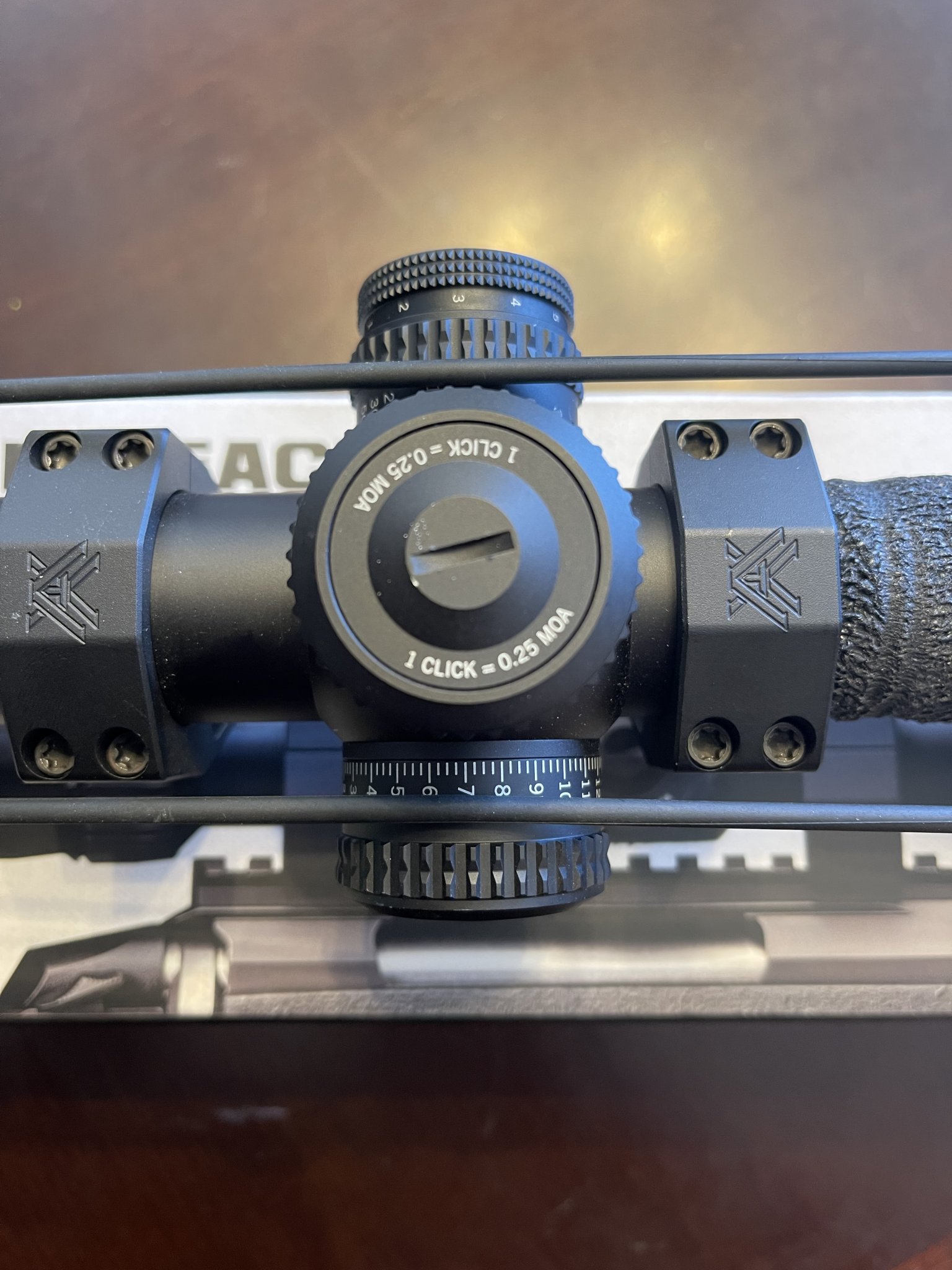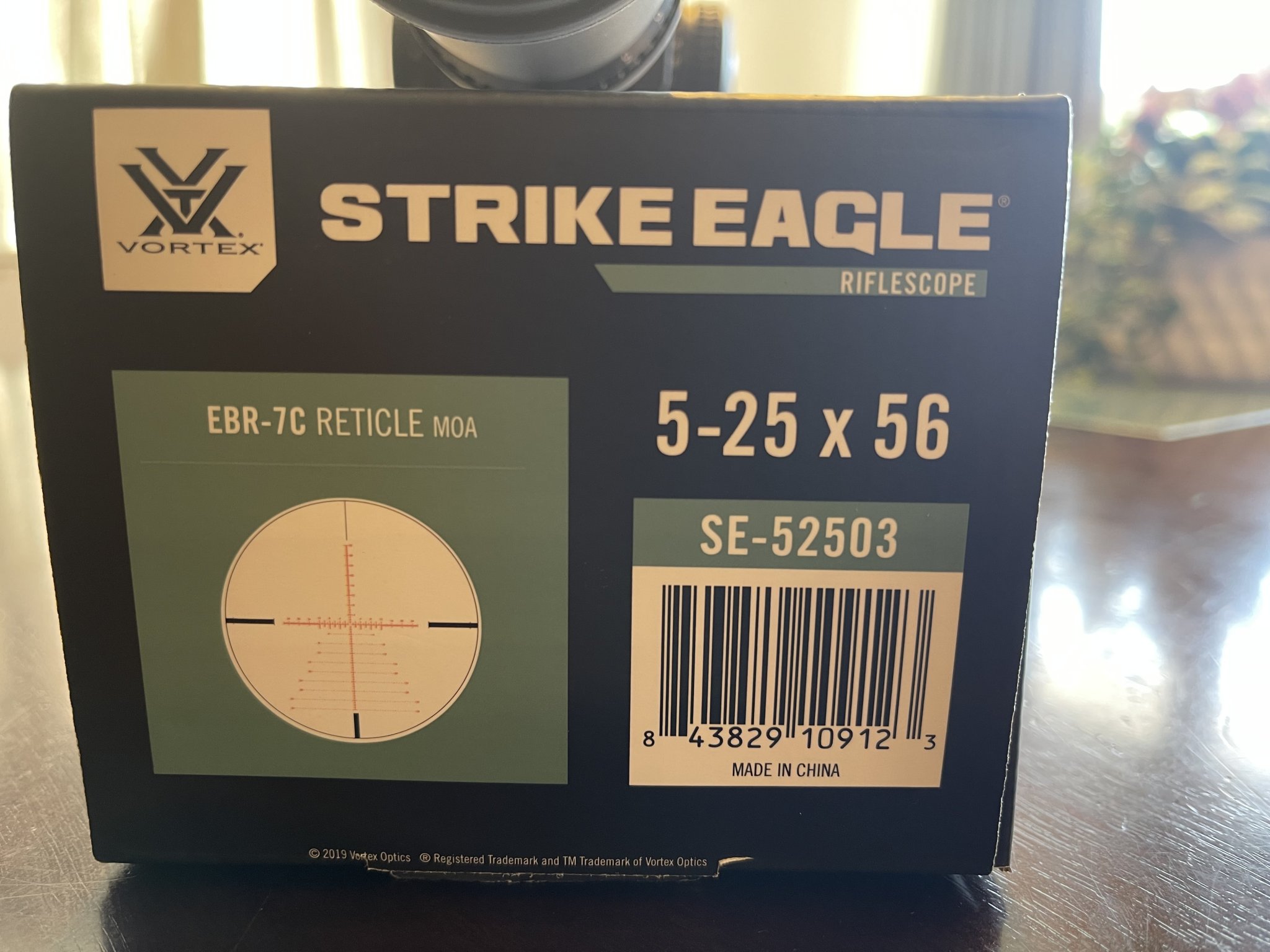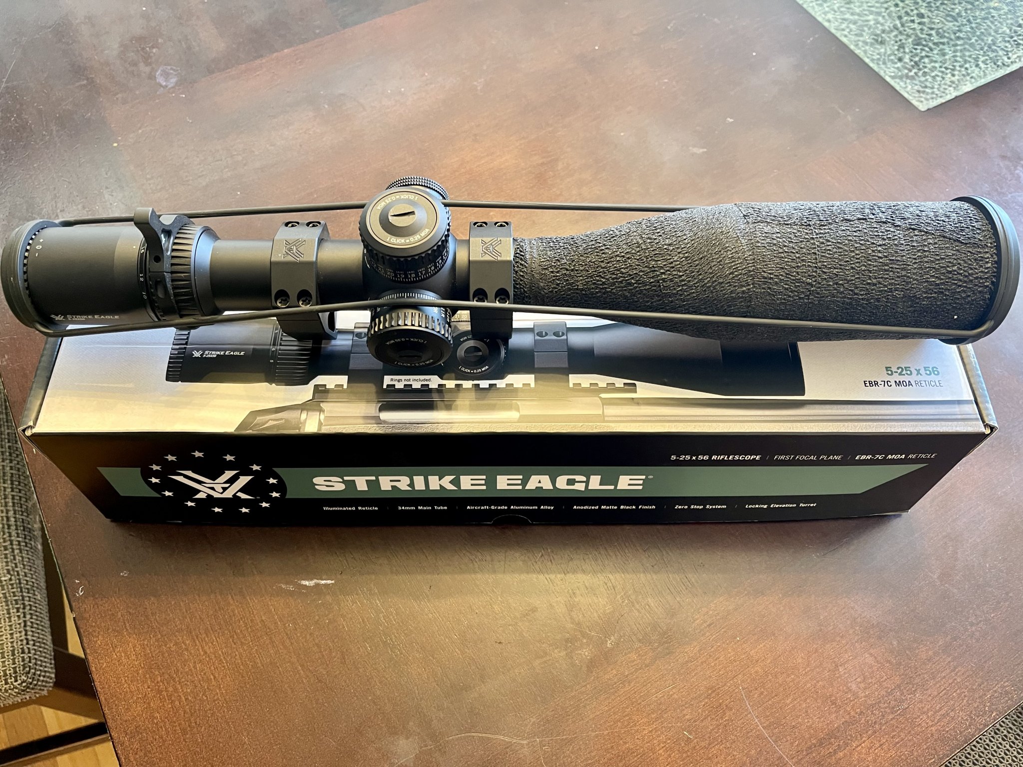 I have a Vortex Strike Eagle 5-25x56mm scope with EBR7C reticle in MOA for sale. It is already mounted and leveled in Vortex PMR rings.