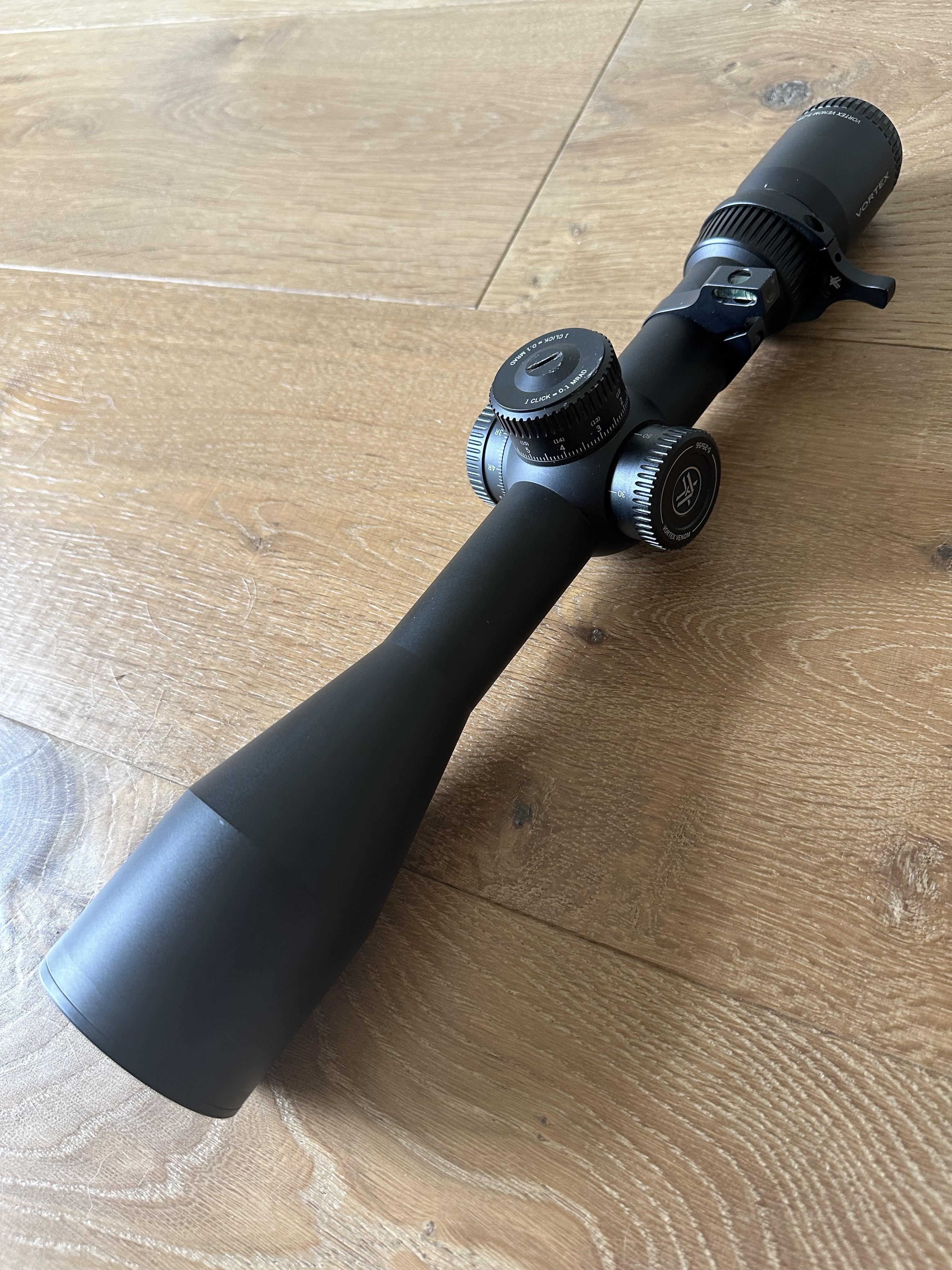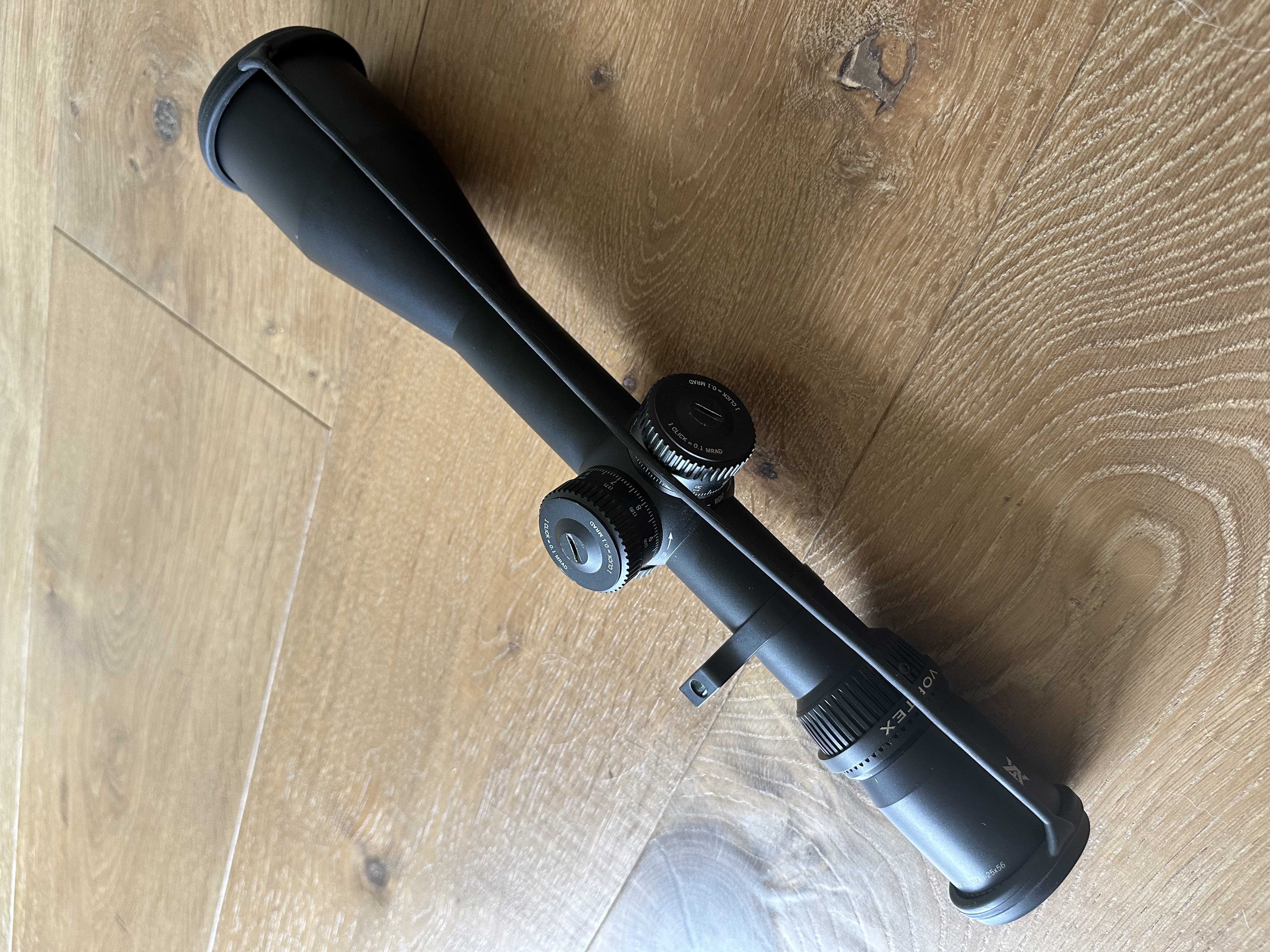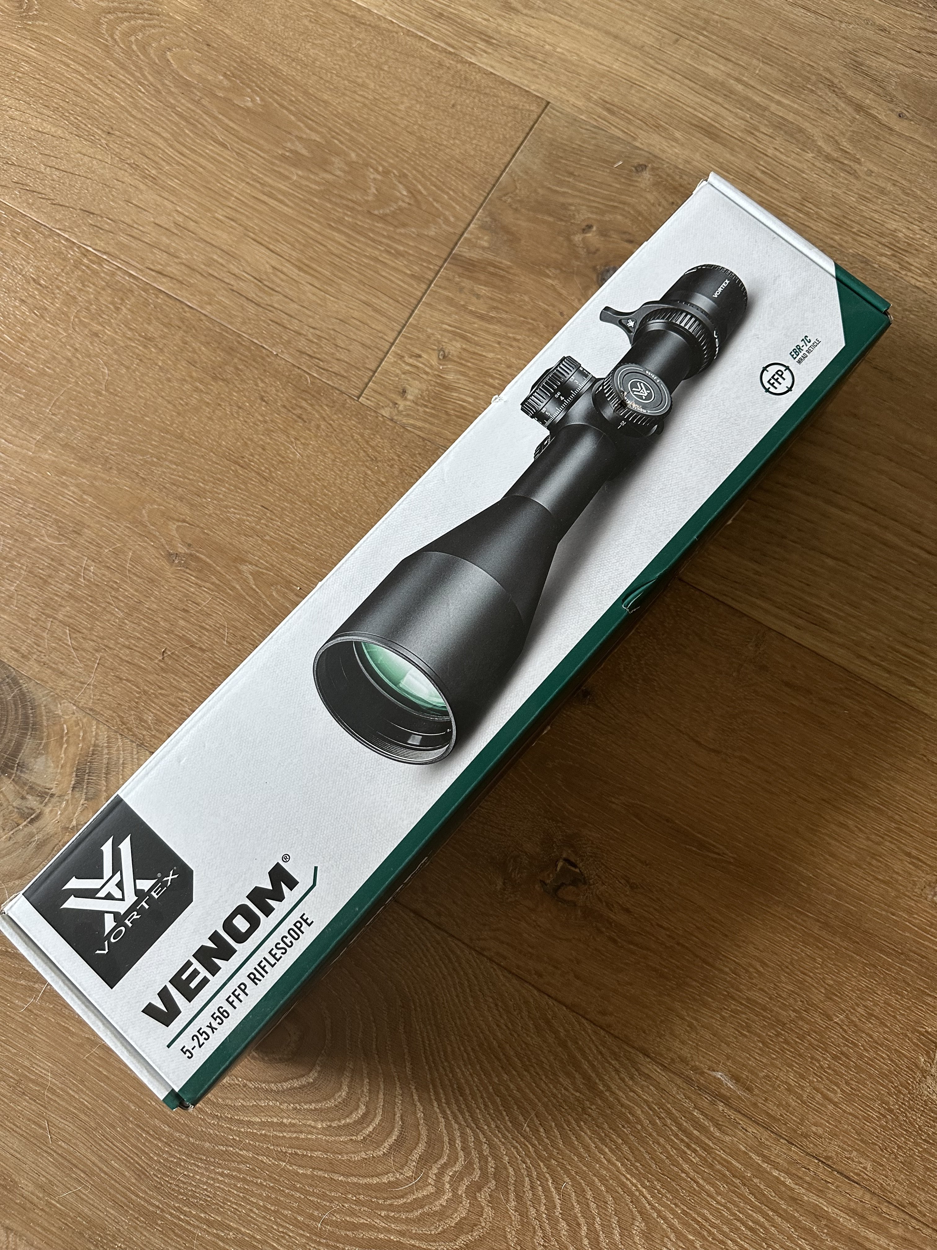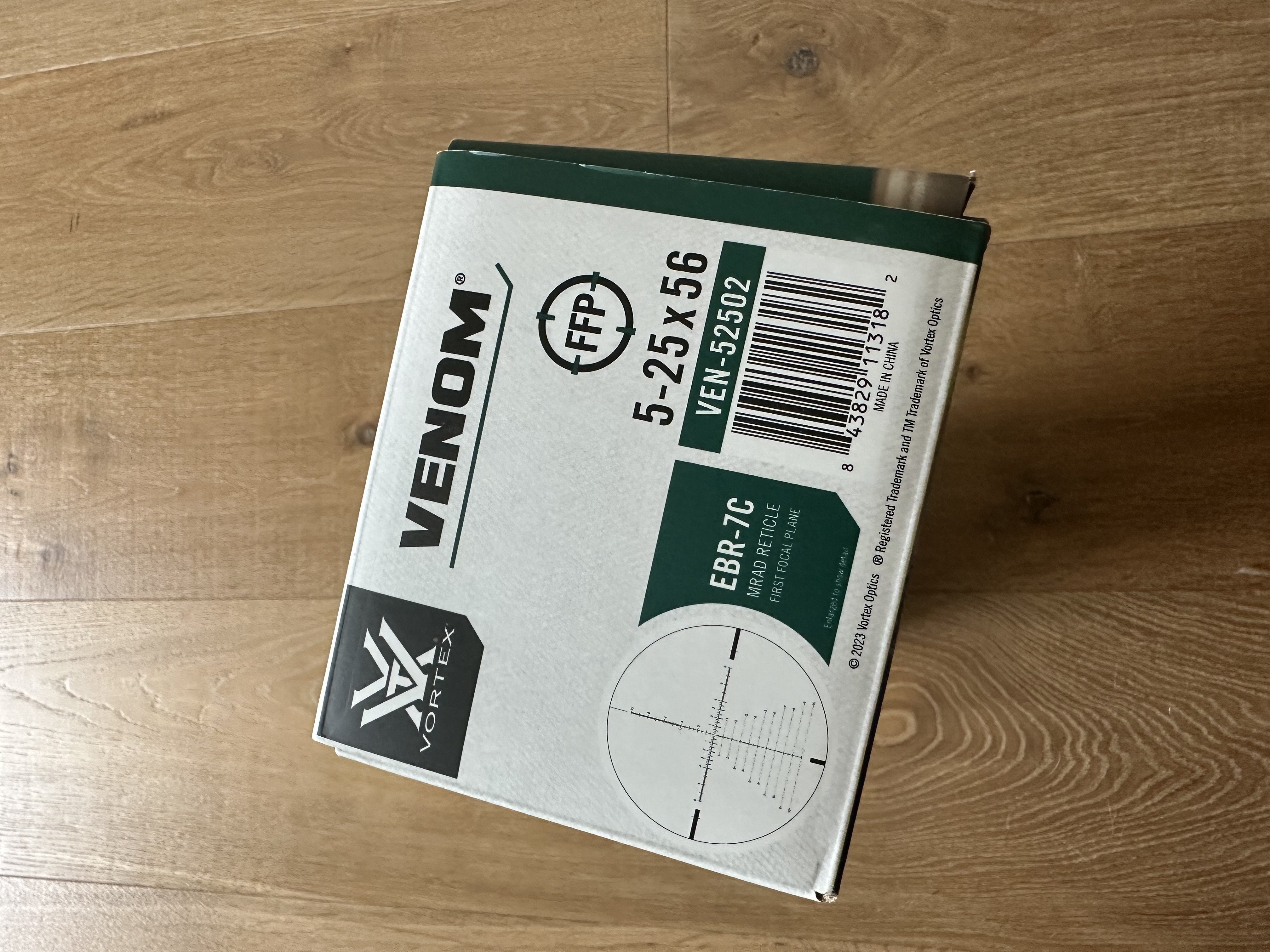 Excellent condition Vortex Venom 5-25 with front focal EBR-7C mil reticle, mil turrets. Comes as pictured with factory box, papers, and bikini cover. Glass and mechanics are perfect, a couple very light/small cosmetic marks on the tube and the edges of the flathead slot on the turret cap (see pics).