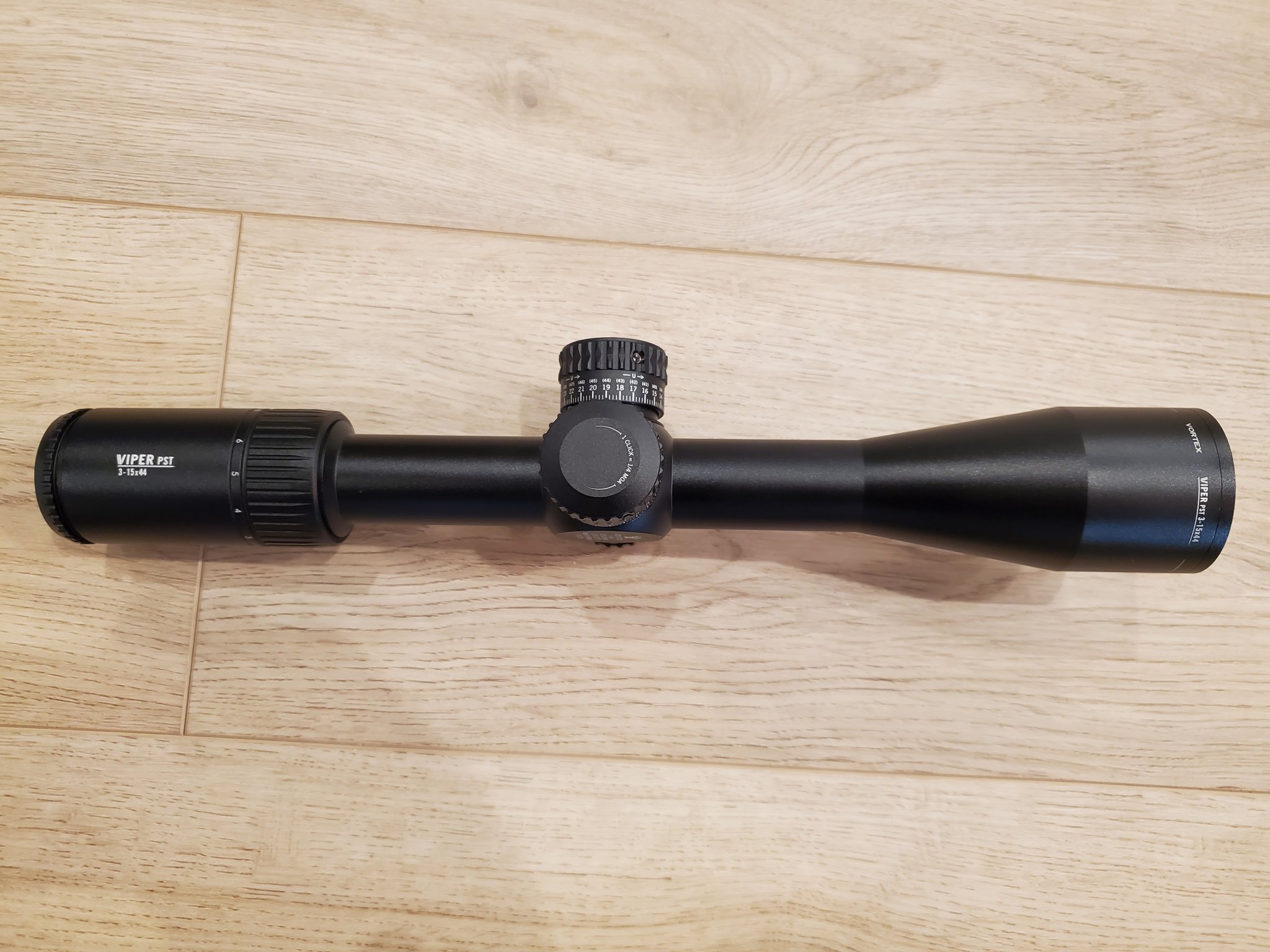 Vortex Viper PST Gen II 3-15x44 Second Focal Plane (SFP) rifle scope with EBR-4 MOA Reticle; Model PST-3151. Like new in box with sun shade, lens covers, cleaning cloth, manual, and window sticker. Also includes a Vortex Sure Fit Neoprene Scope Cover (a $29.99 value).