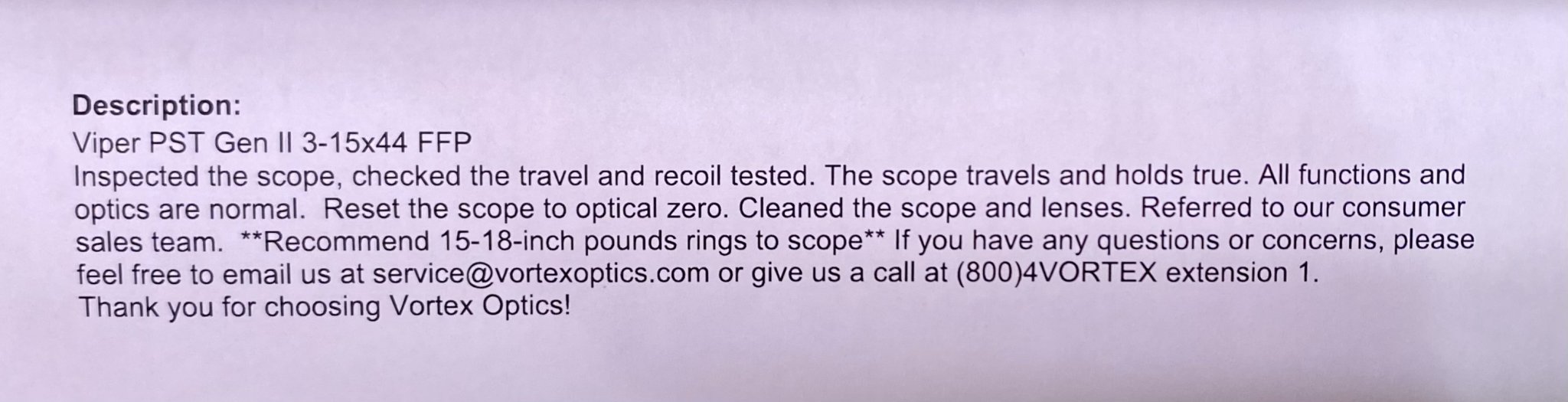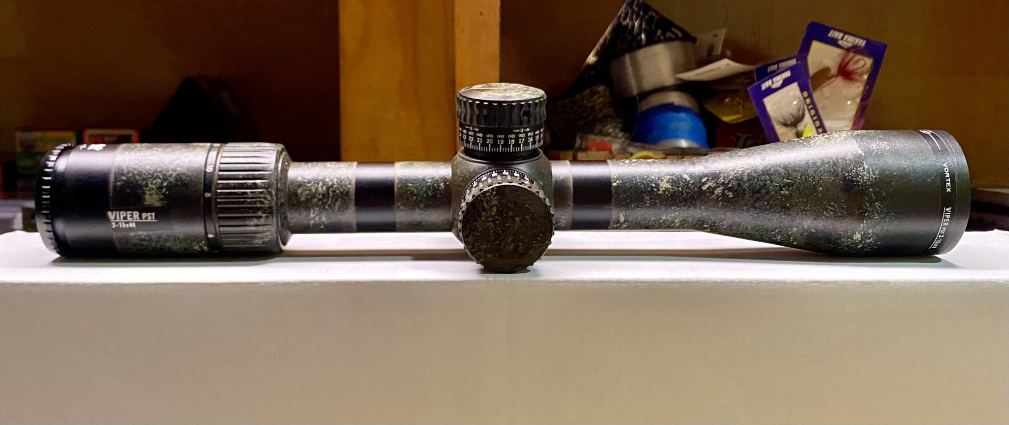 Have a vortex pst Gen II 3-15x44 with the MOA reticle for sale. It was painted by myself with krylon and care lol. It had been sitting unmounted for a little while so I sent it to vortex for a check up/confirmation and glass cleaning and return to optical zero before selling (see documents). Vortex does this for free FYI if you ever want it done to your scope. Will come with matching painted defender scope covers.