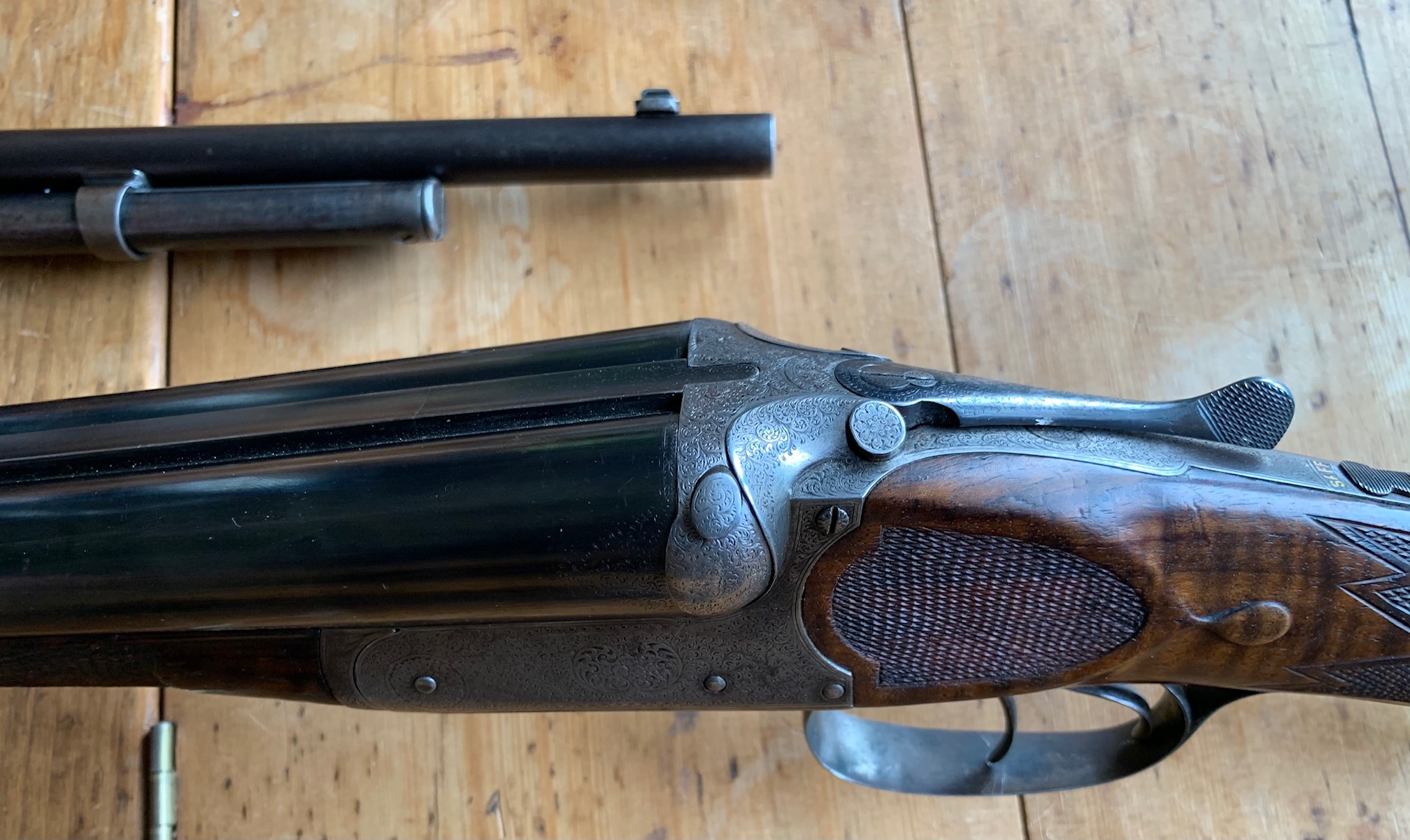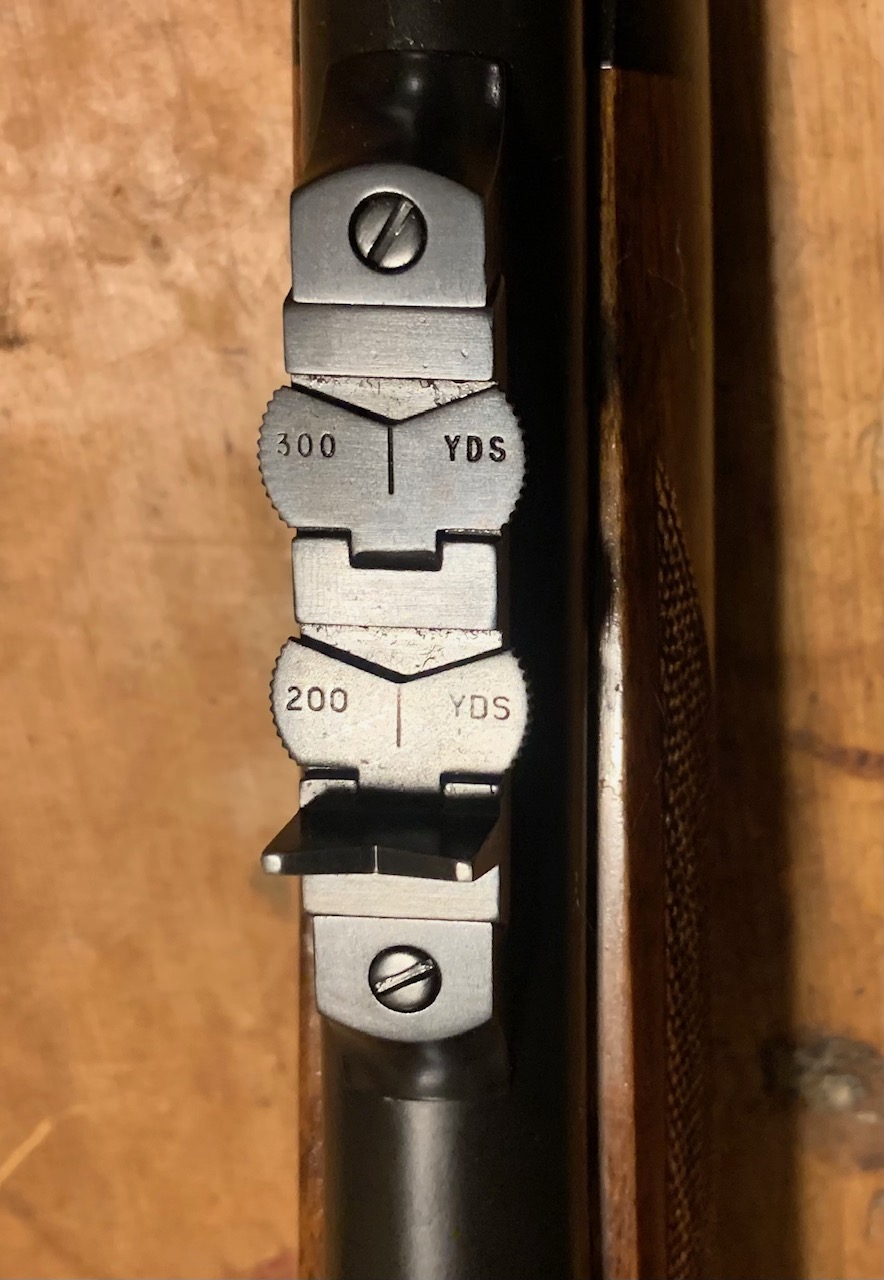Simple, but beautiful safari sight with pop-up blades. It's a .470 Capstick... a cannon. So no scope on this. Just an express sight.