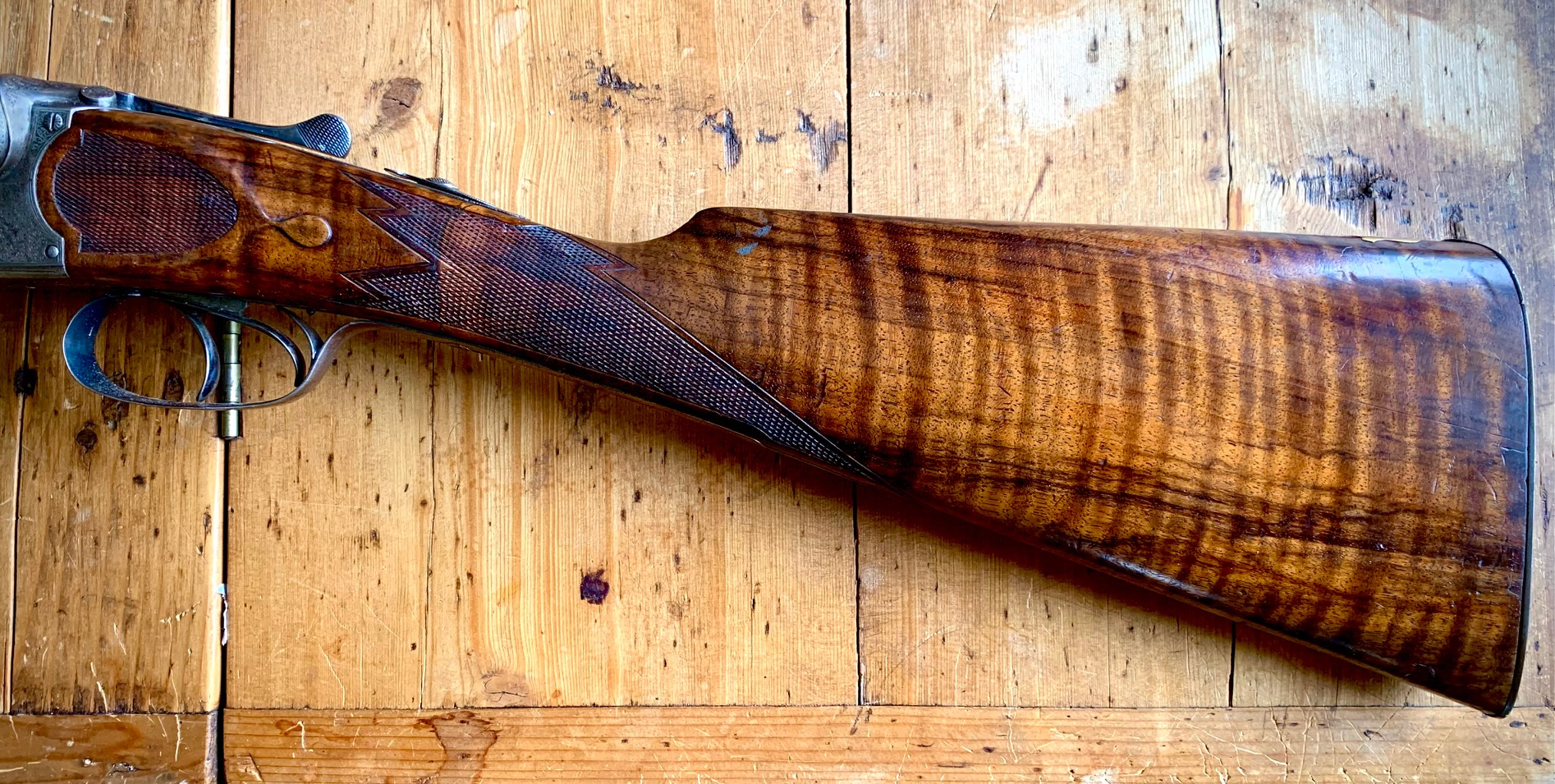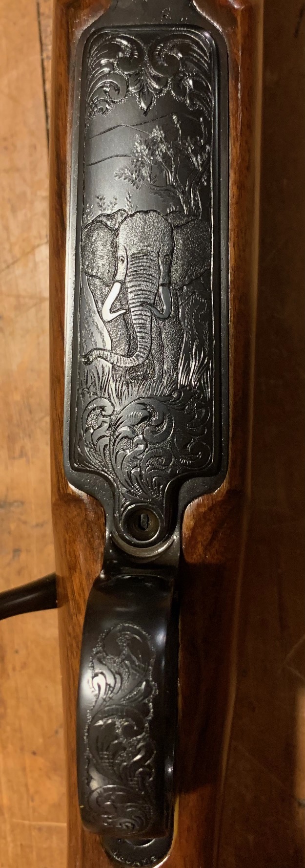 John had fun with the Hefalump! Much more intricate than I had thought he would do. I had sort of planned this build to be a 'working African Rifle...' but the sort of thing a successful and prosporous PH might have had. Not some 'client' showpiece. But a good working gun with a few 'personalizations' by its owner. But I think John Adams wanted to have some fun with this and did an amazing job. The elephant is incredible in the light and just has such a great personality! I think John just got in a groove and though it's more than I was looking for, I'm over the moon pleased with it!!! Wow!