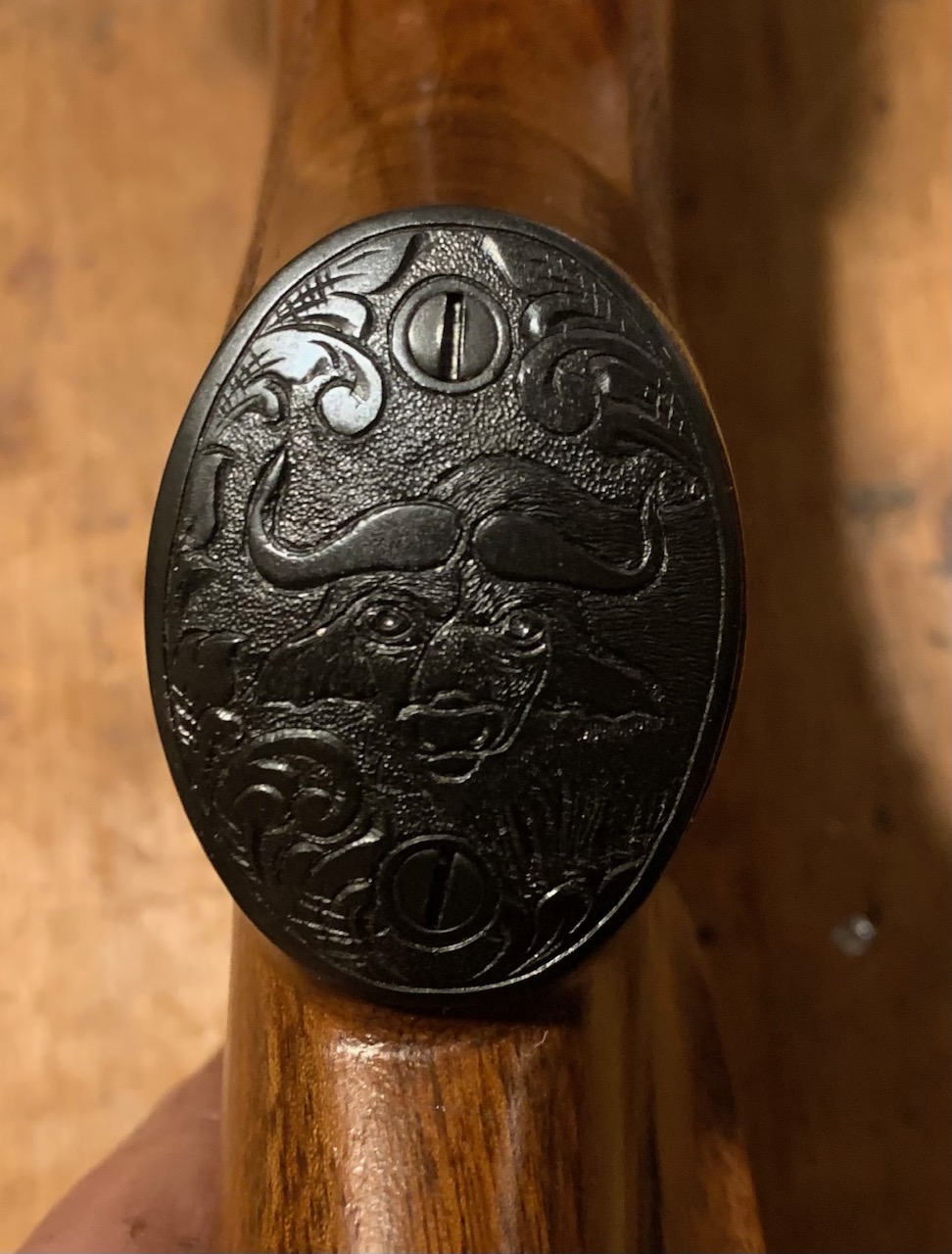 Grip cap (the whole rifle is in the style of Rigby) with M'Bogo on it. He doesn't look happy.