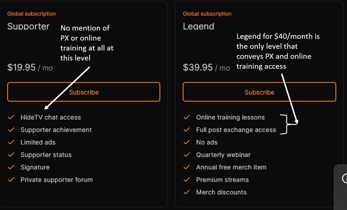 A $40/month subscription doesn't meet my financial needs and if that's what it takes to get PX and online training access then I'm hard pressed to see the benefit to me for signing up at any level.
