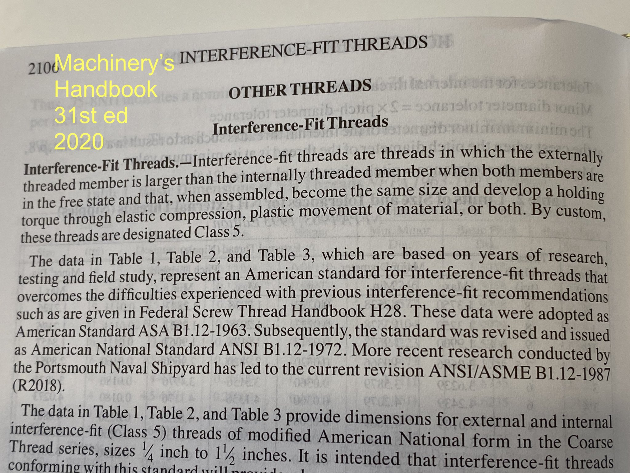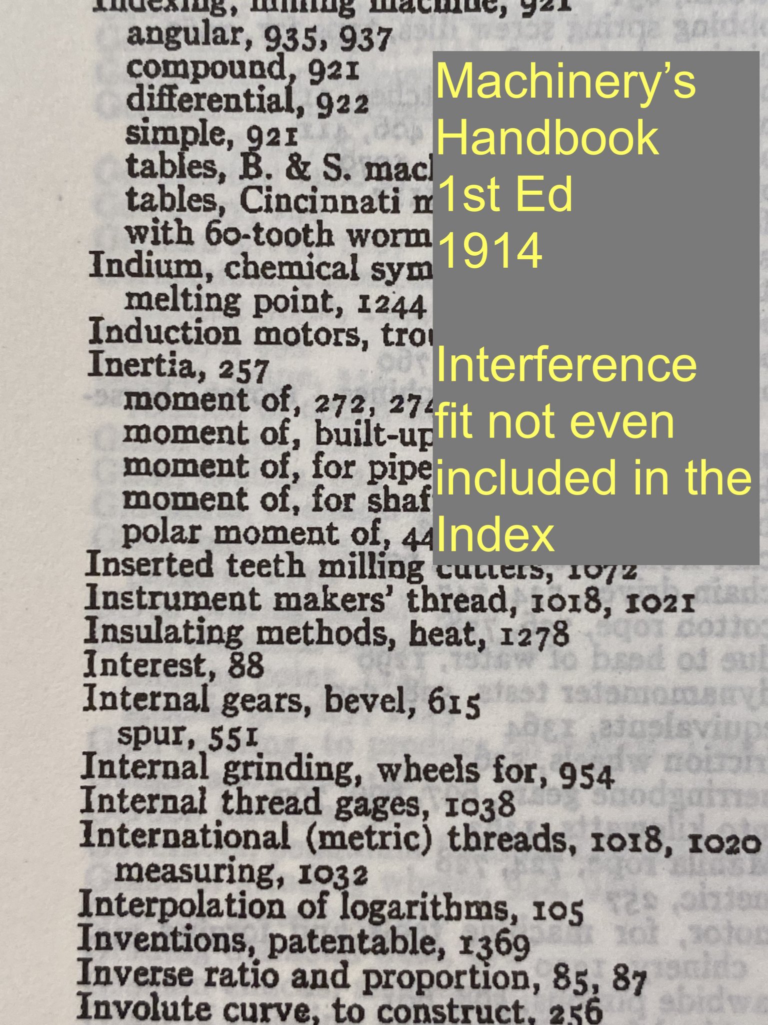 In the original Machinery's Handbook 1914 Edition, the term interference fit was neither defined or referenced. The latest 31st Edition defines an interference fit. A lot has changed.