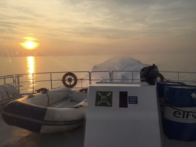 Sunset view from Ferry crossing the Adriatic Sea to Pula, Croatia 2 hours ago. Looking aft/westward in the direction of Venice, Italy. Very hazy, but the doldrums made for a very smooth ride....