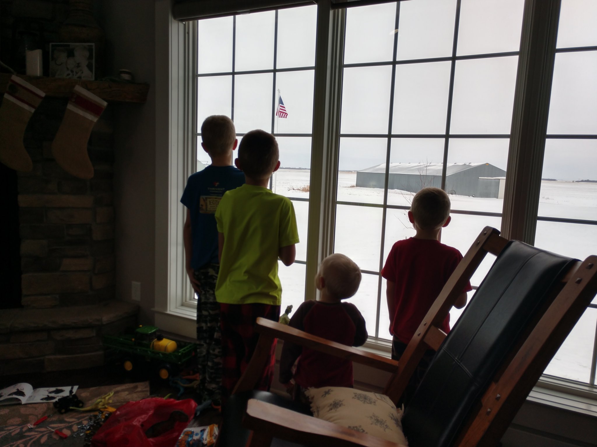 The 4 boys are all better after being sick, busy playing with their new gifts and all went to the window with hands over hearts when the Star Spangled Banner came on. Good kids! Unfortunately mom is sick now this morning! Hopefully dad and the little 2.5 month old girl can keep from getting it!