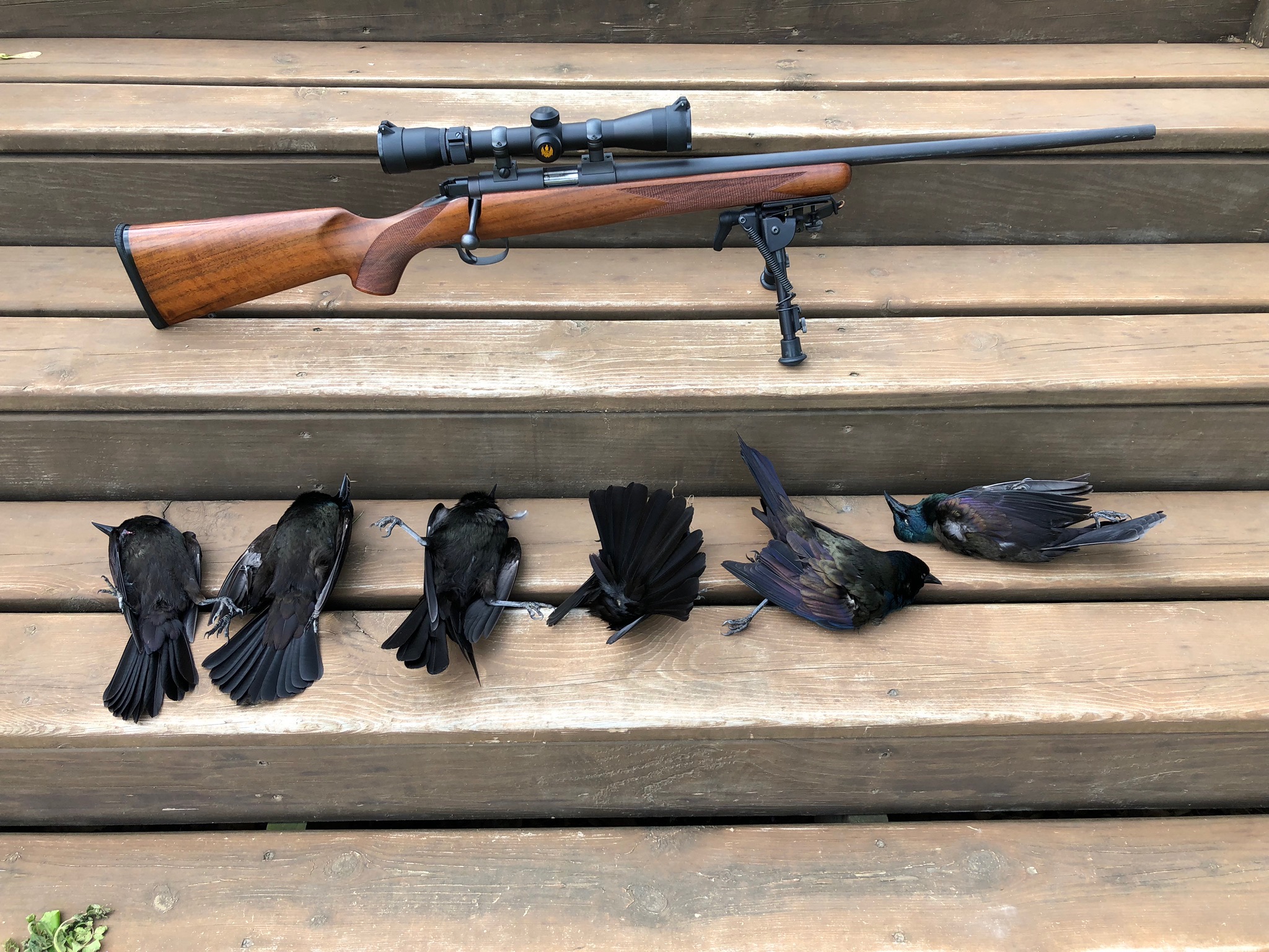 Rifle?I’m gone literally 26 hours (gotta pay the bills ya know) and in my absence the Grackles called all their deadbeat relatives and said come on over. I get home this afternoon at 1500 and within 30 minutes this is my take from the kitchen window and deck slider. Good barricade type practice.