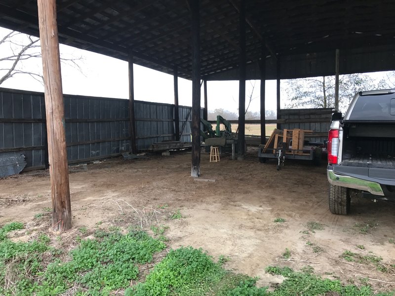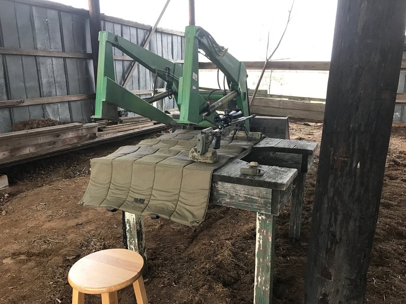 The hay barn isn't being used these days, so today I set up a "Plan B", all-weather alternate Firing Position. Near target is 740, far targets are 1070. Pretty cool place to be when it's raining hard.