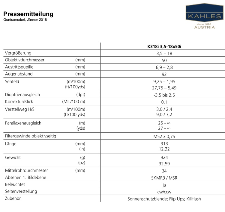 On paper the new Kahles 318i looses agains s&b 3-20x50.. The s&b is lighter, have better field of view, more elevtion and higer top magnification.. Im a littel disappointed!