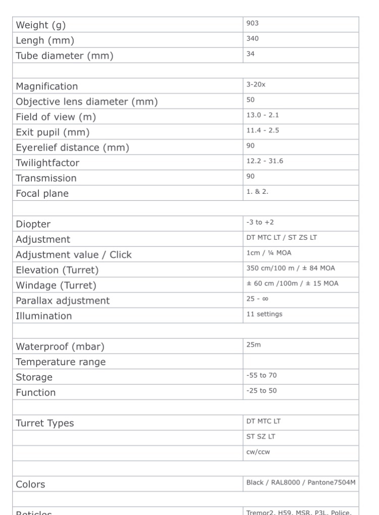 In the past month both Kahles and Steiner have announced new long range scopes that weren't mentioned at SHOT, not quite sure why Kahles and Steiner would not have mentioned anything at SHOT as that is typically where the buzz happens, but for whatever reason they decided to wait and have now announced what could be some real contenders in the long range market. Honorable mention goes to March with their new Genesis 6-60x56 FFP ELR scope (which is really not for this market but definitely an ELR option) and to the Bushnell Elite Tactical DMR II Pro (which still has no specs other than it will probably be the exact same as the existing DMR II but get the ED Prime glass treatment). Here are specs on the scopes with the Minox ZP5 5-25x56 and Vortex AMG 6-24x50 as bookends to show a comparison of specs: