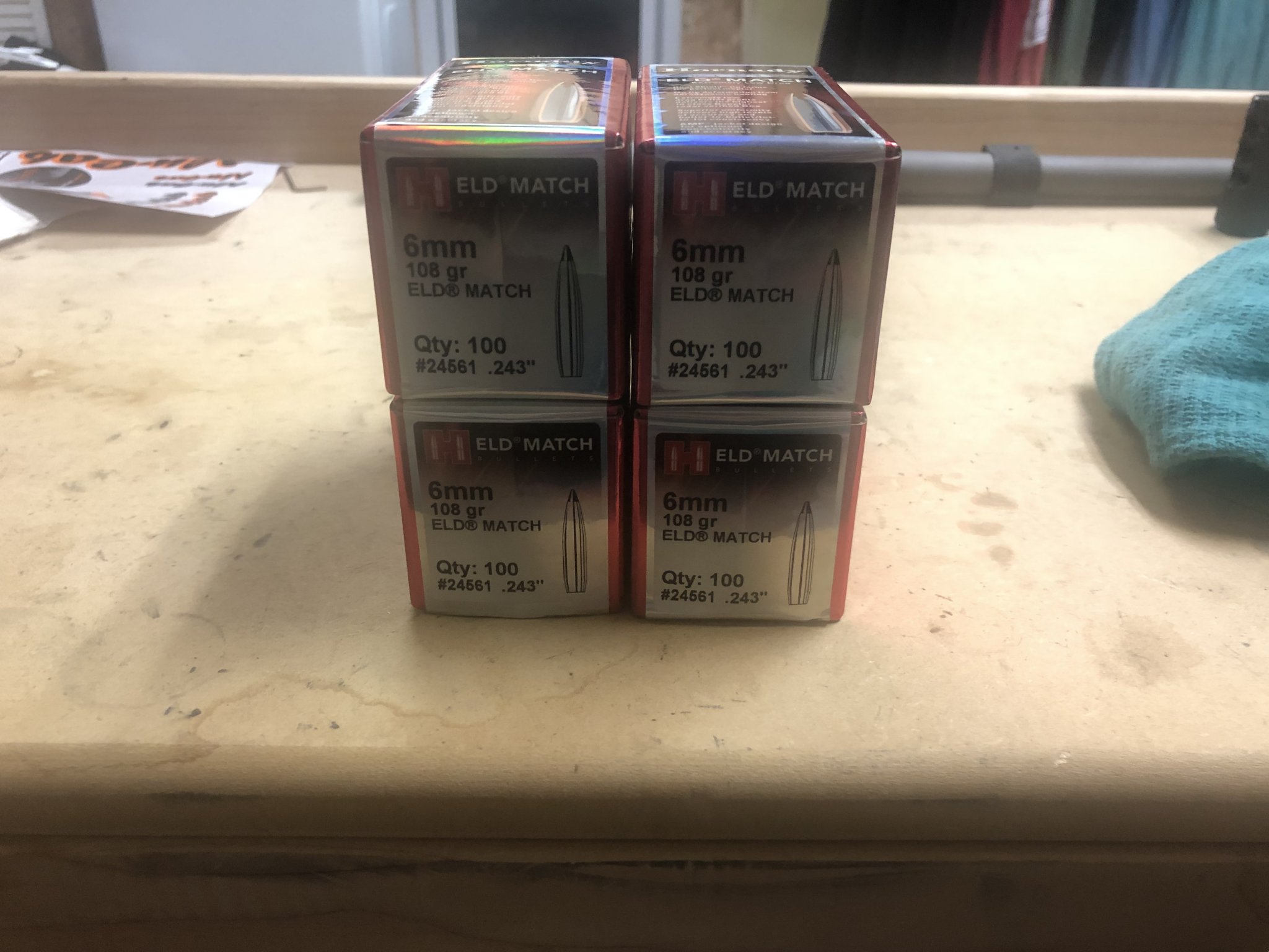 400 Hornady 6mm 108gr ELD-M. One packaged was opened to inspect. $150 shipped.
