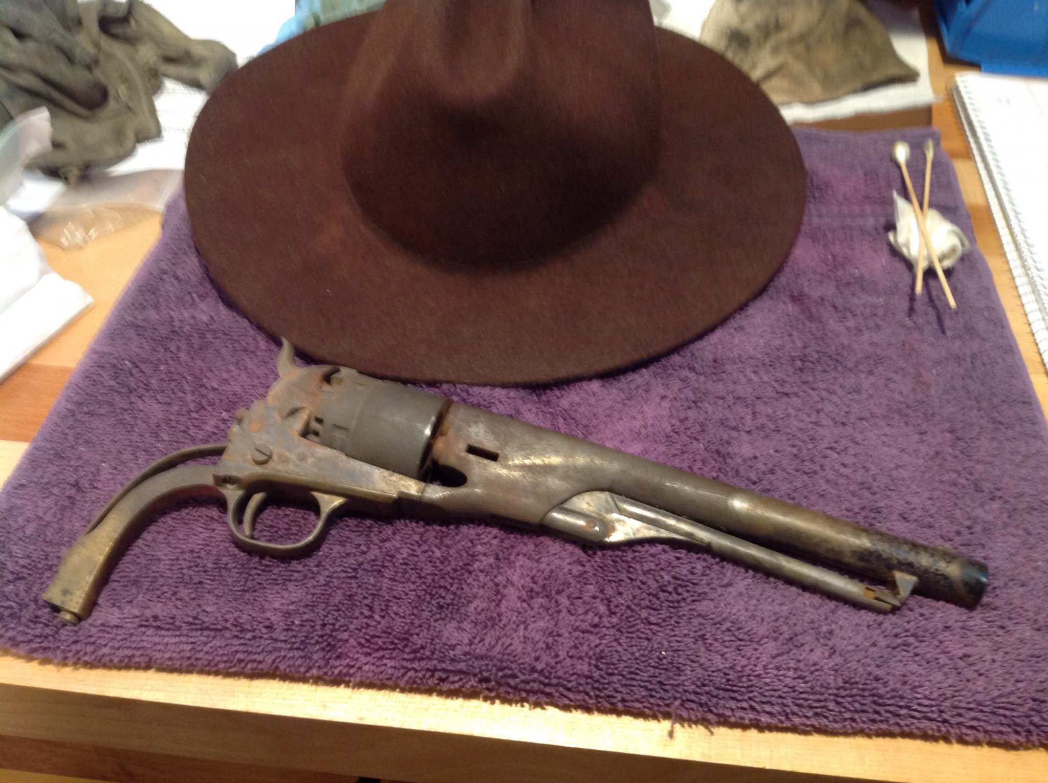 So he got me that hat, an 1860 Army, a brass frame short barrel .44. And a holster rig.