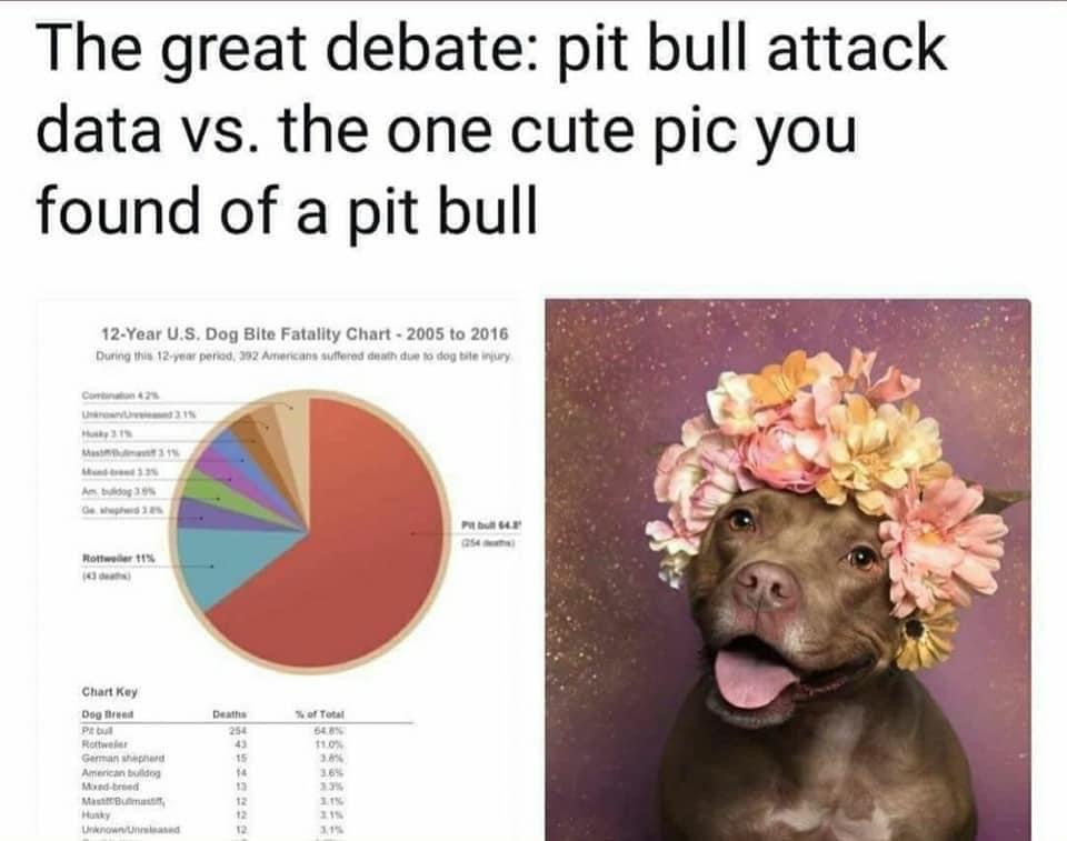 We agree more than you know. I'm definitely not talking about scenarios where someone's kid hopped a fence. My issue is with the lack of accountability among the owners of these dogs. It's actually the same arguement that the pit boys are making. They say that it is bad owners. They've said it here 50 times, but when I talk about holding them accountable for their dogs, they lose their minds and start talking about golden retrievers and chihuahuas. I don't care if someone wants to be tiger king and have a yard full of Bengal tigers, shit, go for it if you can afford it, but if you want that, you should be willing to pay the price for your own failings. If you knowingly house a dangerous animal and then fail to maintain control of it, you should be paid in kind. It isn't your neighbor's kid's fault that you want to own a dangerous animal with its own free will, and if you can't keep it controlled, and they are damaged, you should be pay and pay hard for your decisions. If you don't want that responsibility, get a chihuahua, so they can be just as apt to bite and be aggressive, but nobody will be damaged as a result. The damage is the difference.This is getting into straw man territory, unless (I'm assuming) there was implied context based upon your personal experiences...