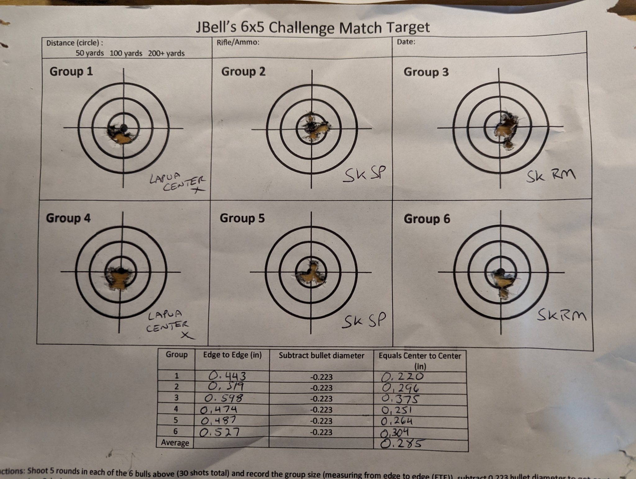 Ahhh, sorry. Yes the 6x5 was @ 50 and the others were at the specified distance (50 & 100). I think I scored them correctly, if not feel free to make the corrections when you post them. Thank you for keeping this alive!JBell, was this 50 yards?