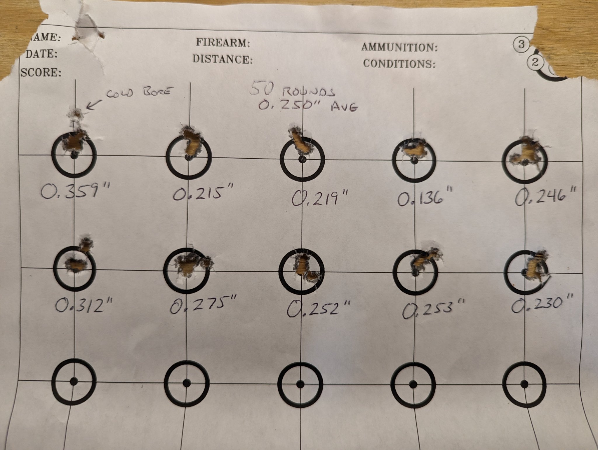 I have my first group including the cold dirty bore on the 50 yard target. Then instincts kicked in on the first target for record and I shot a 5 round group for some reason. So the first 5 of the card are after that second group. Do feel like you have up count this card if you don't think it's fair.