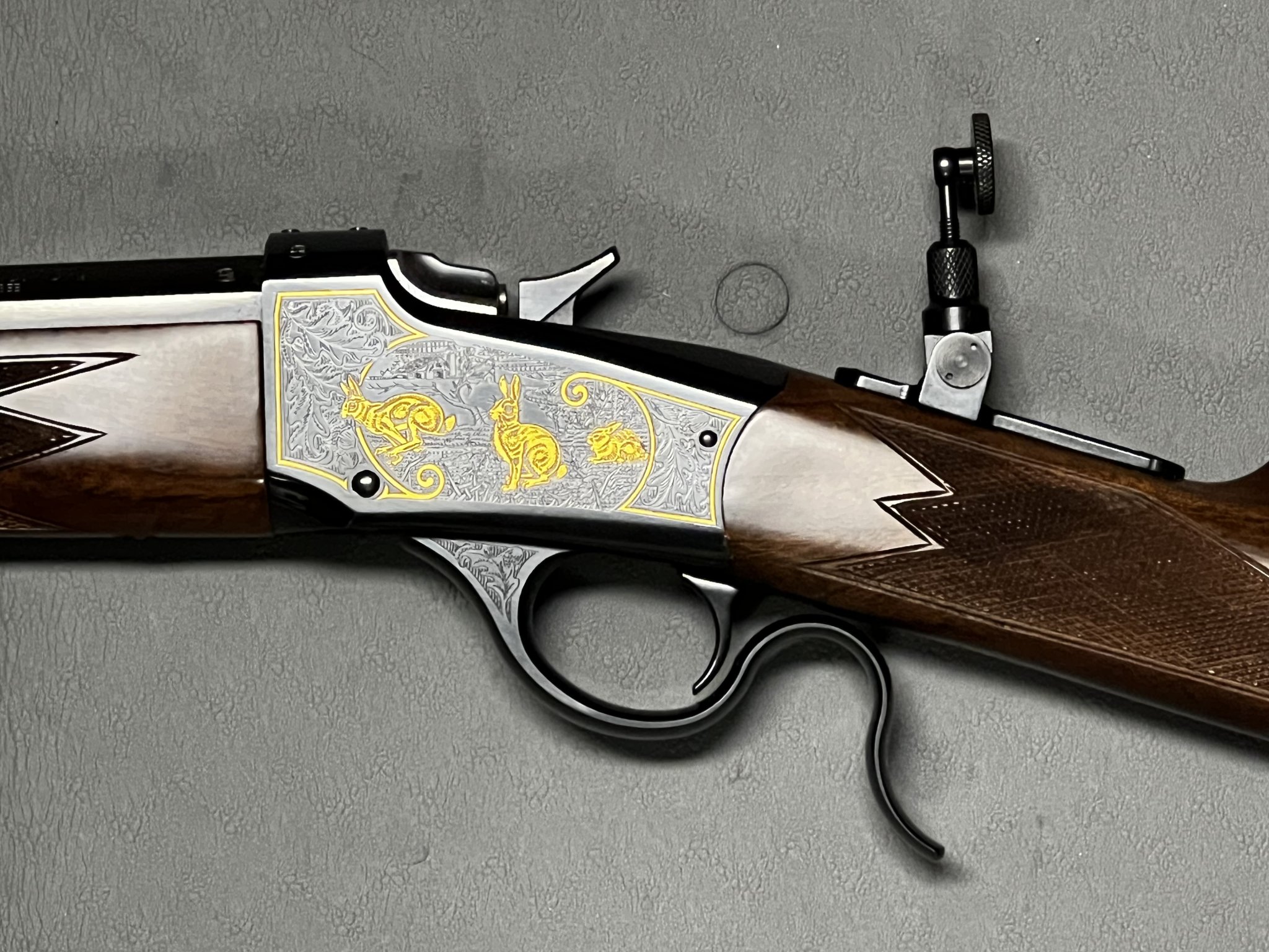 This Winchester/Miroku 1885 low wall in .22 LR appears to be a limited run deluxe model. It has wonderful, gold accented engravings on its polished blue receiver, depicting a pair of squirrels on the right and three rabbits on the left. The barrel is a 24 ½ inch half octagon barrel and it is all sitting in a set of beautiful figured walnut stocks. New condition, very few rounds fired through it. No box. Gun will ship in a gun case. There is one scratch on the stock from moving guns around in a gun safe. Attached photos show details.