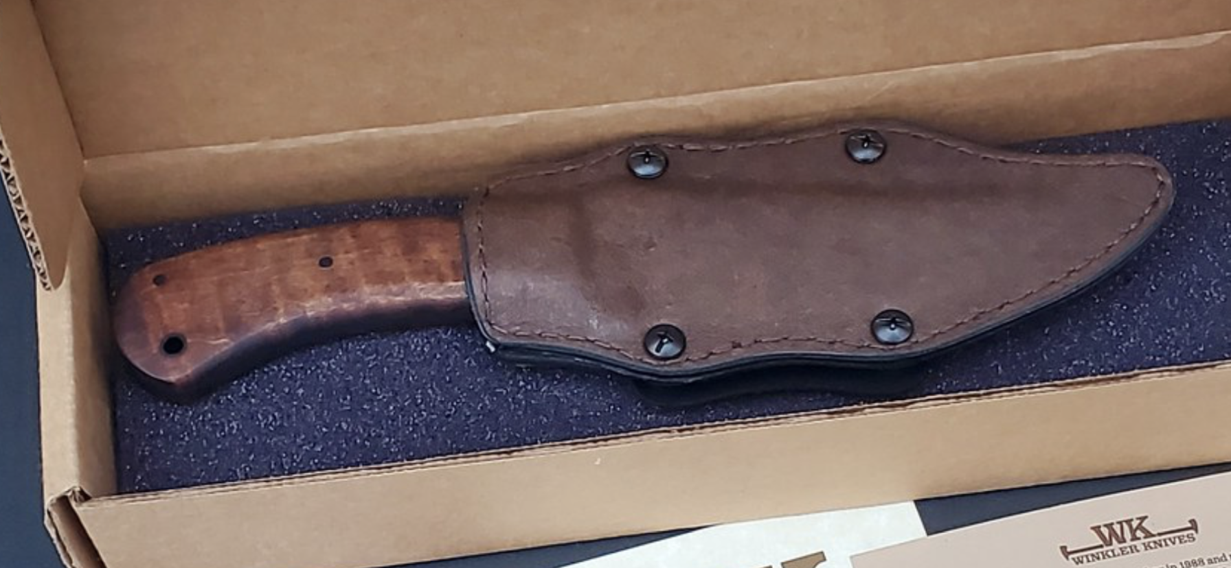 I have for your consideration a Winkler Belt Knife. Brand new, never used, carried or sharpened. Maple handles. Great ergonomics. Blade steel is 80CrV2 with non glare Caswell finish. Comes with beautiful original supple high quality brown leather sheath with excellent retention. No rattle, no noise. Sheath comes with a high quality belt attachment system that can be used to carry knife in multiple positions. Comes with original box, Winkler information card, sheath instructions, inspection card additional screws for belt attachment and sticker.