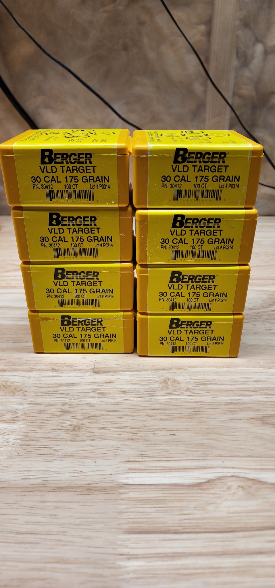 (8) boxes of Berger 30 cal 175gr VLD Target, 100 Count