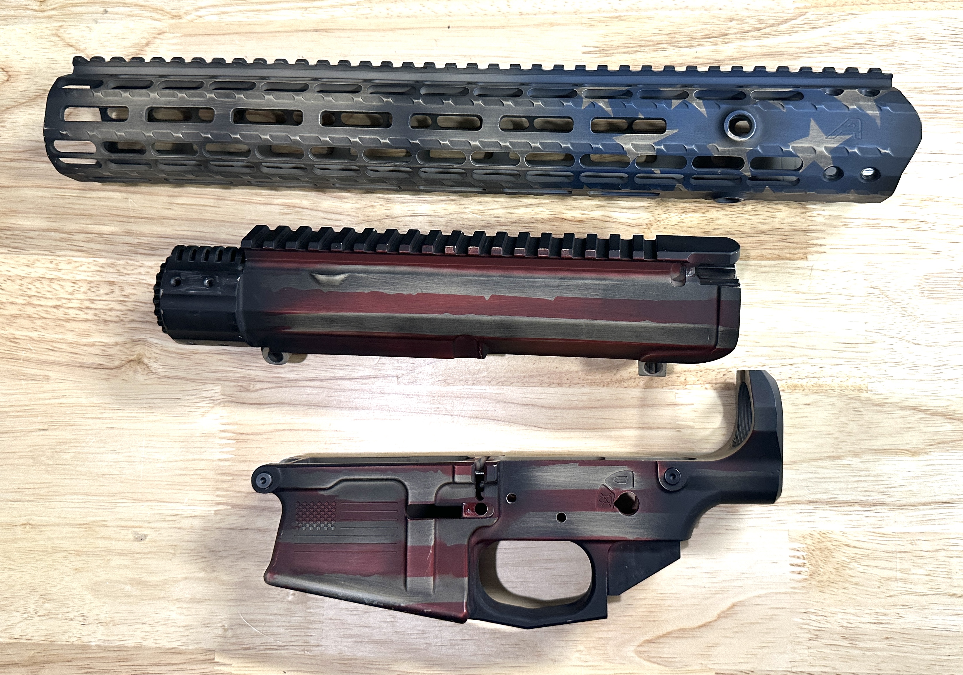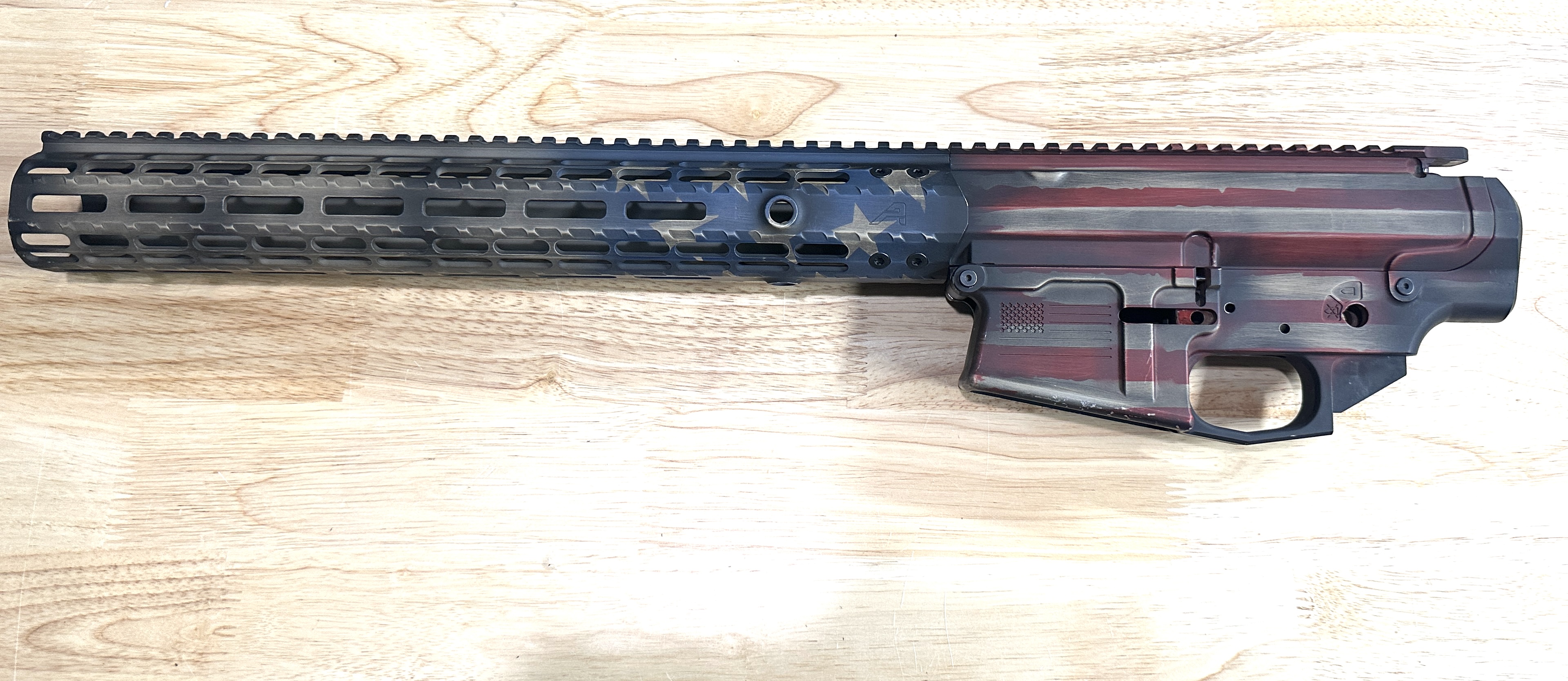 Selling my used Aero Precision M5E1 Enhanced builder set with flag cerakote. This was their spirit of independence set from 4th of july. Ships with what you see. There are cosmetic scratches in the cerakote as this set was used. The upper receiver has been face lapped. This has the 15” enhanced handguard that attaches to the upper receiver instead of the barrel nut.