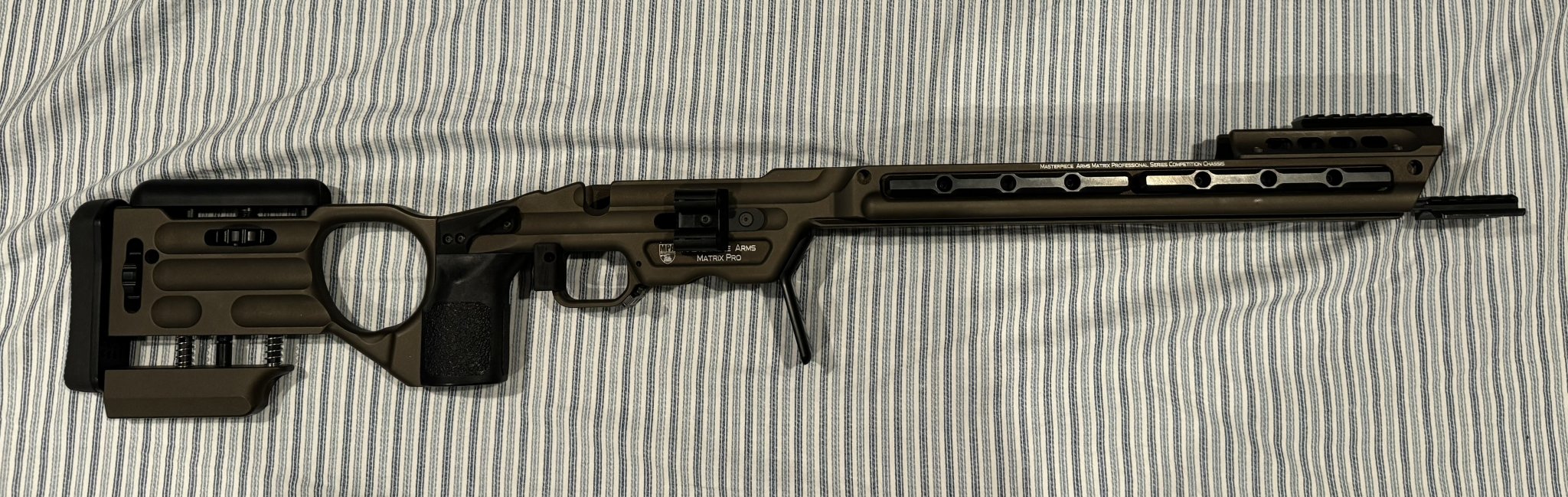 I have a bronze Remington short action matrix pro chassis that I’m looking to get rid of. I’ve used it for two matches and there are very light signs of use. Nothing crazy on it. It’s still in great condition. Comes with everything you see in the photos. External weight kit, internal weight kit, bag stop, and two round holder on the right side. I have both of the grips that came with it. Swept 2 and vertical 2. Asking $1300 for everything. Preferably using PayPal friends and family or Venmo