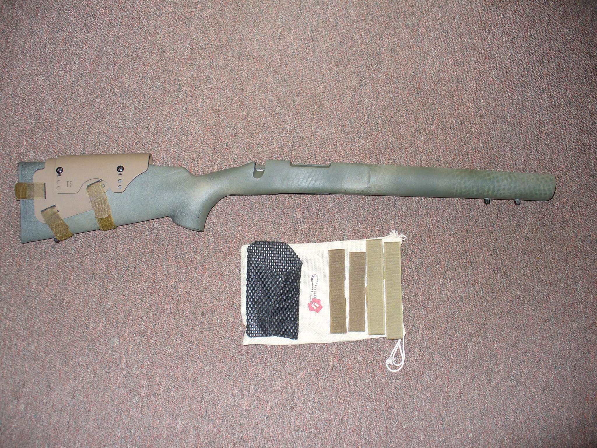 I have for sale one H.S. Precision Police stock removed from my C prefix Remington 700 PSS short action rifle. This stock features the aluminum bedding block, Rem 700 BDL hinged floorplate inlet and Rem. Varmint/Sendero barrel channel and has a light coat of Krylon on it but is in perfect condition with no issues. The barrel was perfectly centered when installed. Also included is one Bradley Adjustable Cheek Rest in FDE (cost $112.00) with extra straps, internal pad, instruction sheet and Bradley key chain. $295.00 shipped for both. Payment by Paypal F&F (no mention of gun parts) or USPS M.O.