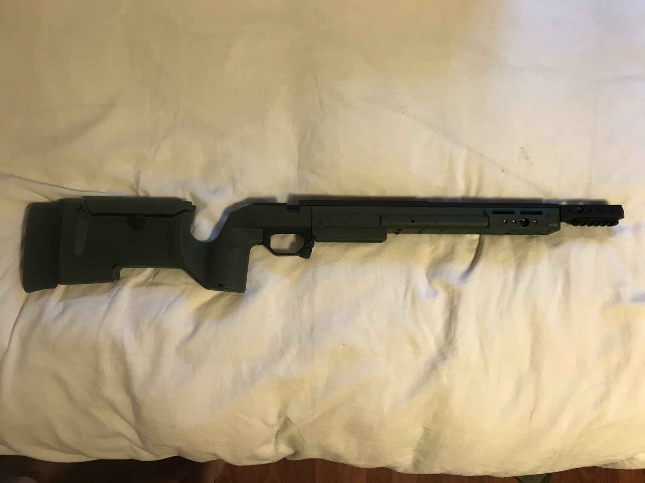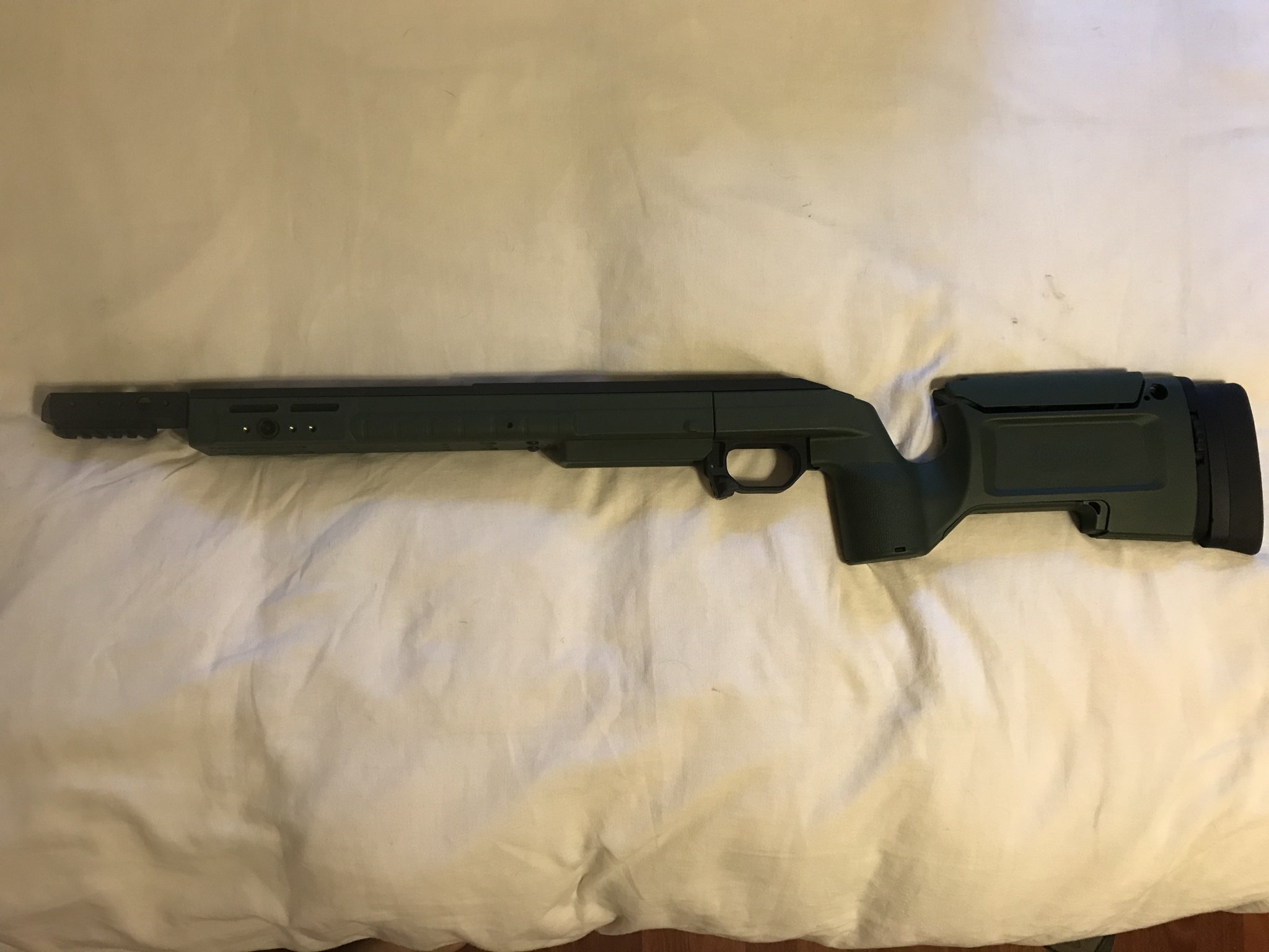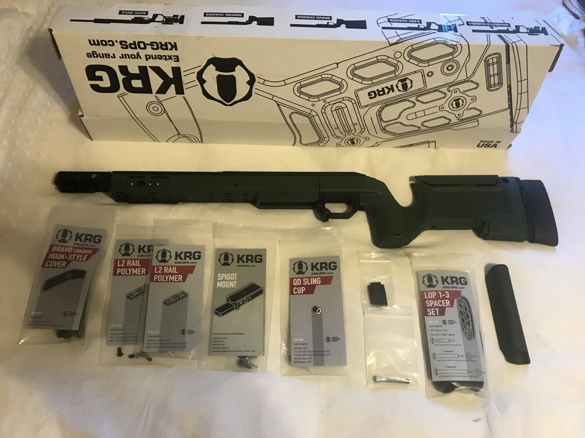 KRG Bravo RH stock, long action, CIP length mag well, Sako green color. Very lightly used, still looks new.
