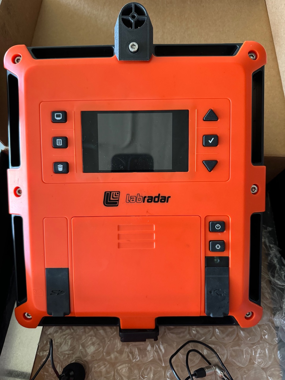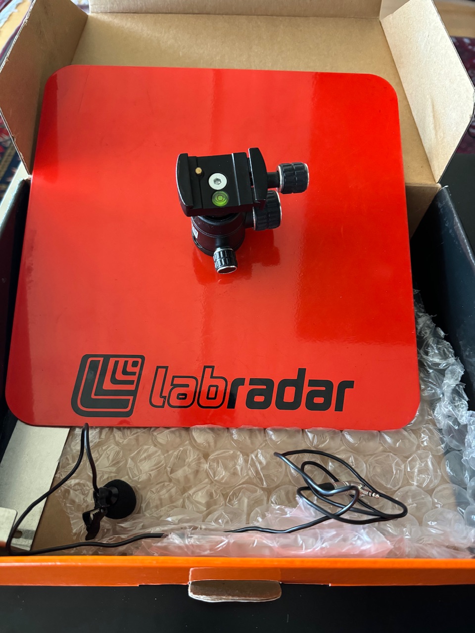 WTS very good condition used Labradar with metal base, microphone, and box.