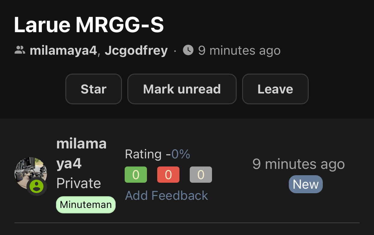 Larue MRGG-S. 20” 6.5 Creedmoor. Sub 100 rounds through it. Comes with one magazine, barrel wrench, plastic case, and all the paperwork I received with it. Shoots lights out with factory ELD-X (only thing I’ve put through it).