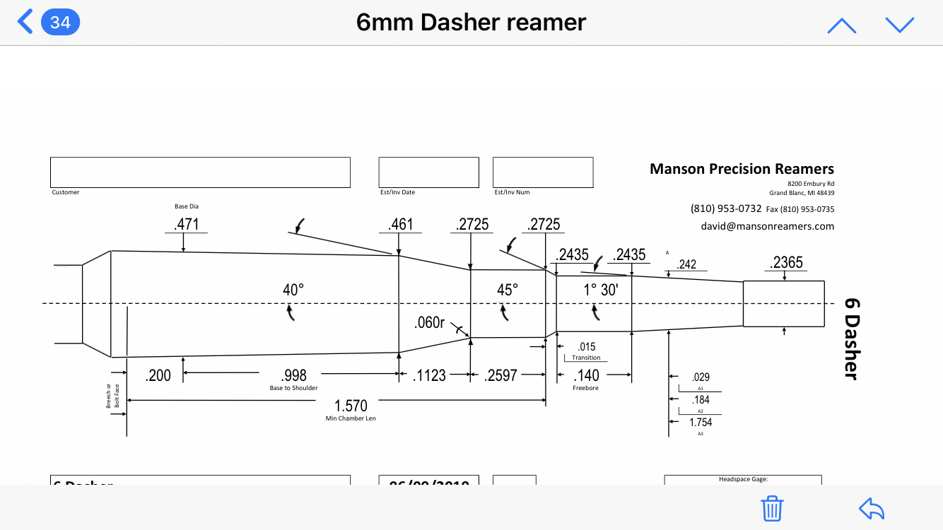 Want to sale a Mason 6 Dasher reamer with go and no gauges. Has a removable pilot .2725 neck and .140 freebore.