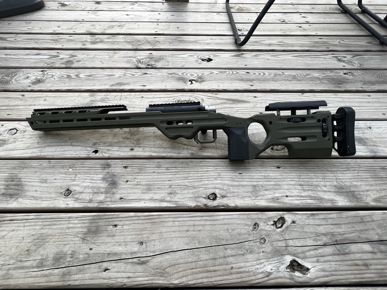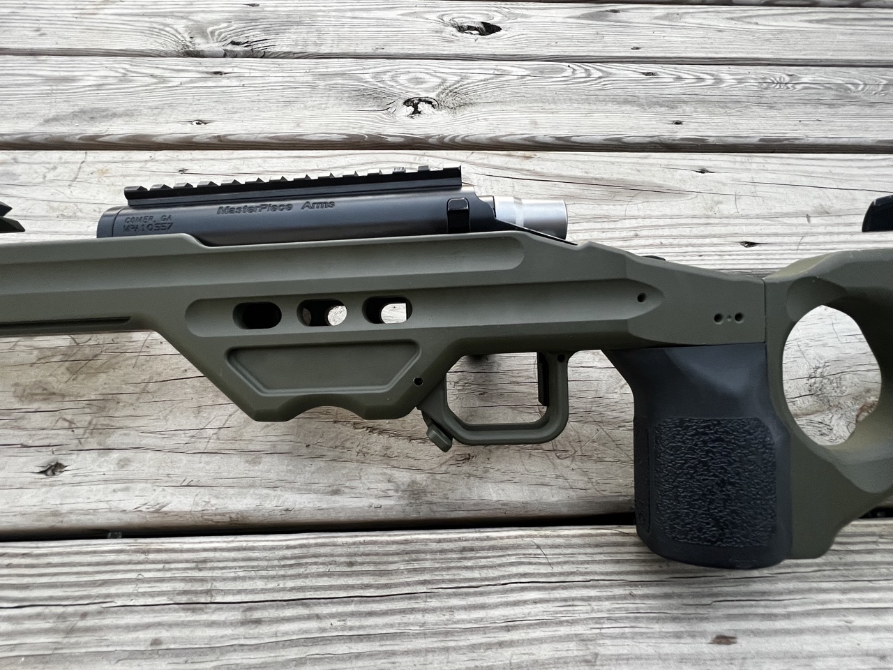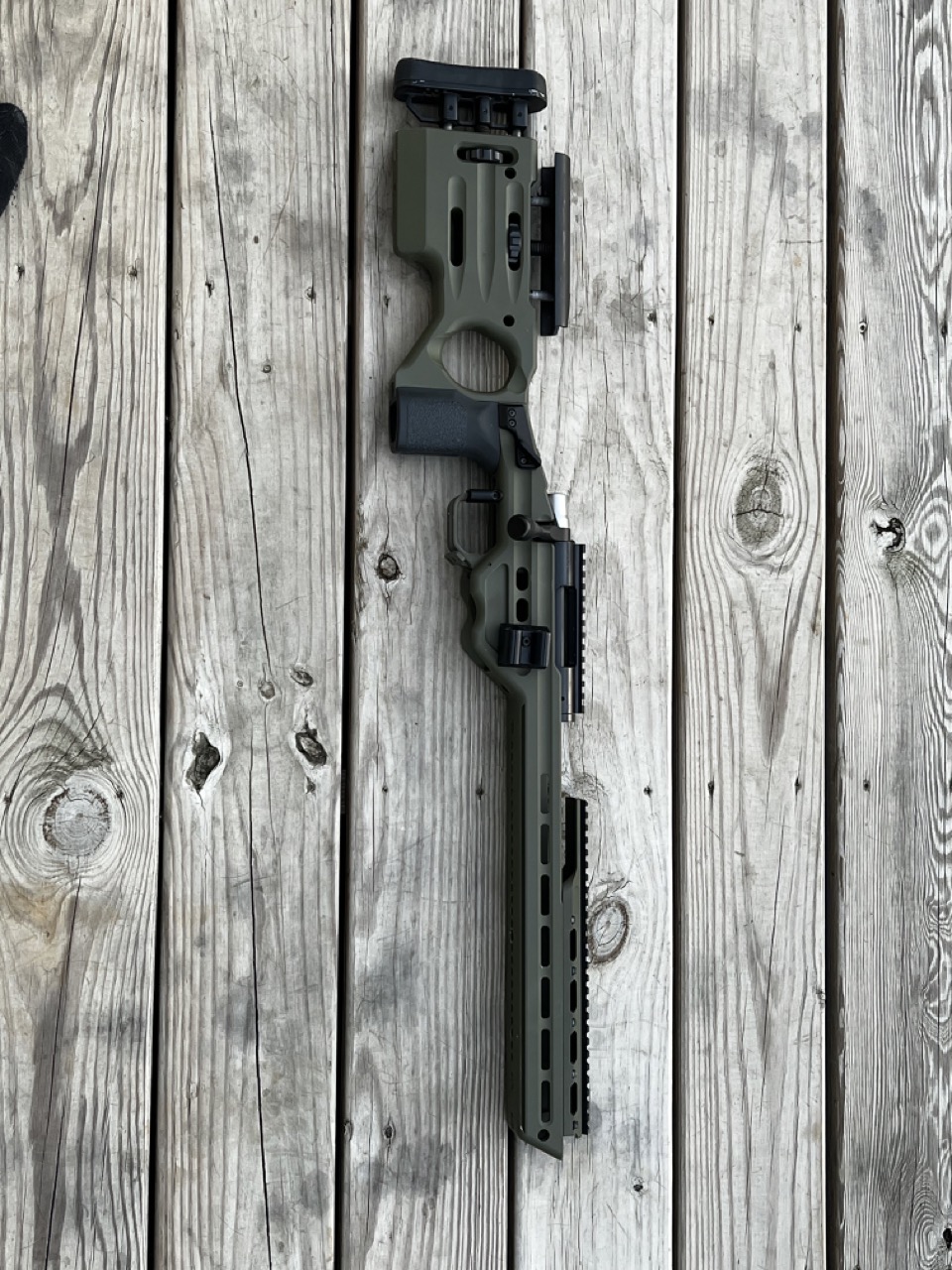 Up for sale is an action and chassis that has seen quite a few rounds and reworks by Masterpiece Arms. The chassis falls into their competition chassis systems. This one in particular is the matrix chassis with trigger thumb rest and two round holder on the right side of the receiver. Adjustable length of pull and cheek riser.