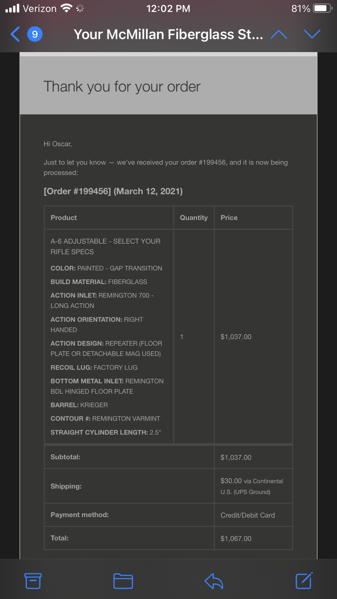 Selling my McMillan A6 stock. I bought this earlier this year with plans to A-B it next to an A5 and keep whichever felt better on me. It is brand new out of the box - had the barreled action dropped in it but never fired a round in it. Selling for $925 TYD. Save a hundred bucks and the 6-8 week lead time from McMillan.