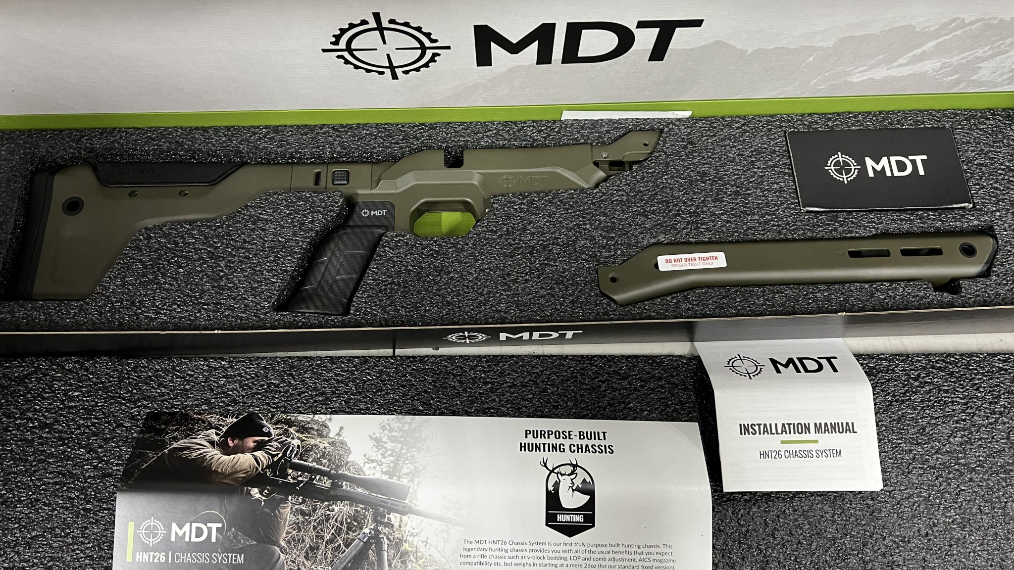 For your consideration is a NIB MDT HNT26 Rem SA RH OD Green folding chassis system .